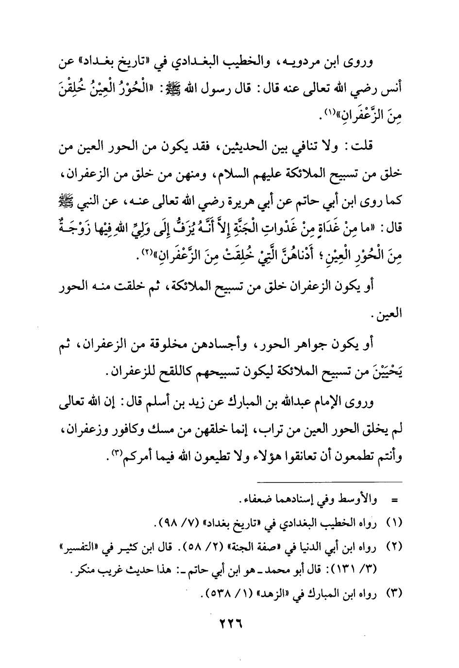 وروى ابن مردويه، والخطيب البغدادي في "تاريخ بغداد" عن أنس رضي الله تعالى عنه قال: قال رسول الله - صلى الله عليه وسلم -: "الْحُوْرُ الْعِيْنُ خُلِقْنَ مِنَ الزَّعْفَرانِ" (¬1).