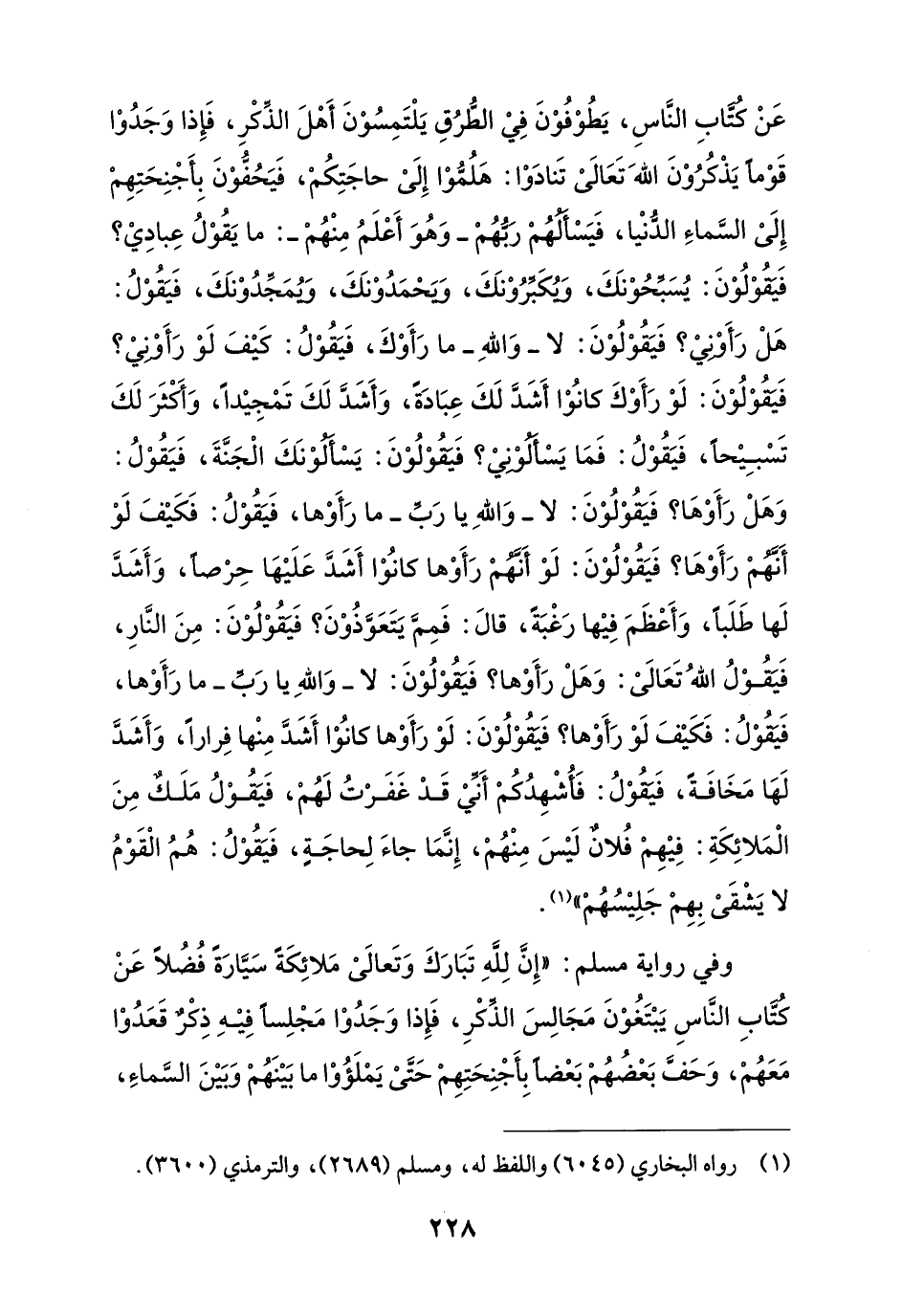وفي رواية مسلم: "إِنَّ للهِ تَبَارَكَ وَتَعالَىْ مَلائِكَةً سَيارَةً فُضُلاً عَنْ كُتَّابِ النَّاسِ يَبْتَغُوْنَ مَجَالِسَ الذكْرِ، فَإذا وَجَدُوْا مَجْلِسًا فِيْهِ ذِكْرٌ قَعَدُوْا مَعَهُمْ، وَحَفَّ بَعْضُهُمْ بَعْضًا بِأَجْنِحَتِهِمْ حَتَّىْ يَمْلَؤُوْا ما بَيْنَهُمْ وَبَيْنَ السَّماءِ،