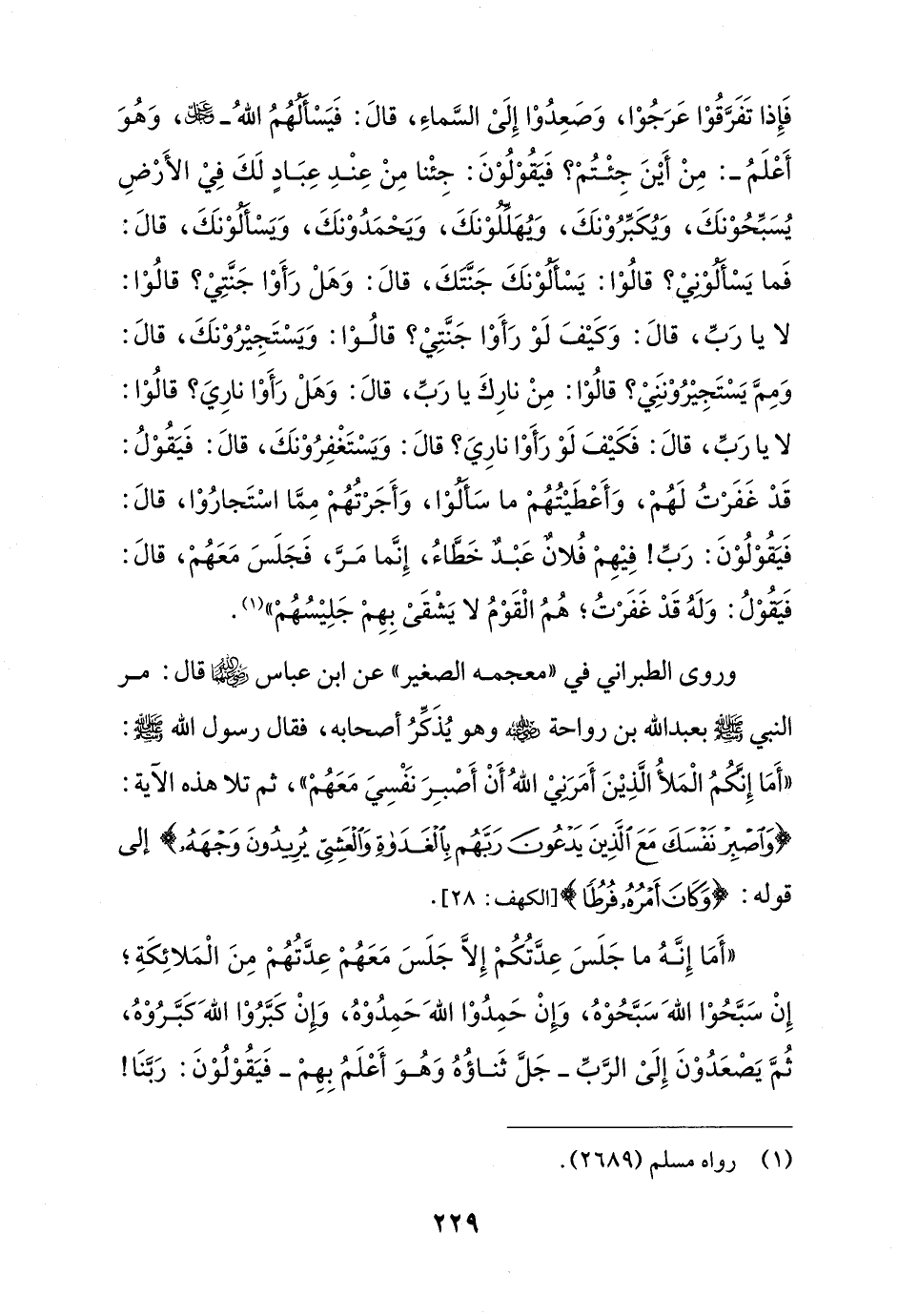 فَإِذا تَفَرَّقُوْا عَرَجُوْا، وَصَعِدُوْا إِلَىْ السَّماءِ، قالَ: فَيَسْألهُمُ اللهُ -عز وجل، وَهُوَ أَعْلَمُ -: مِنْ أَيْنَ جِئْتُمْ؟ فَيَقُوْلُوْنَ: جِئْنا مِنْ عِنْدِ عِبَادٍ لَكَ فِيْ الأَرْضِ يُسَبِّحُوْنَكَ، وُيكَبِّرُوْنَكَ، وَيُهَللوْنَكَ، وَيَحْمَدُوْنَكَ، وَيسْألوْنَكَ، قالَ: فَما يَسْألوْنيْ؟ قالُوْا: يَسْألوْنَكَ جَنَّتَكَ، قالَ: وَهَلْ رَأَوْا جَنَّتِيْ؟ قالُوْا: لا يا رَبِّ، قالَ: وَكَيْفَ لَوْ رَأَوْا جَنَّتِيْ؟ قالُوْا: وَيسْتَجِيْرُوْنَكَ، قالَ: وَمِمَّ يَسْتَجِيْرُوْننِيْ؟ قالُوْا: مِنْ نارِكَ يا رَبِّ، قالَ: وَهَلْ رَأَوْا نارِيَ؟ قالُوْا: لا يا رَبِّ، قالَ: فَكَيْفَ لَوْ رَأَوْا نارِيَ؟ قالَ: وَيَسْتَغْفِرُوْنَكَ، قالَ: فَيَقُوْلُ: قَدْ غَفَرْتُ لَهُمْ، وَأَعْطَيْتُهُمْ ما سَألوْا، وَأَجَرْتُهُمْ مِمَّا اسْتَجارُوْا، قالَ: فَيَقُوْلُوْنَ: رَبِّ! فِيْهِمْ فُلان عَبْدٌ خَطَّاءُ، إِنَّما مَرَّ، فَجَلَسَ مَعَهُمْ، قالَ: فَيقُوْلُ: وَلَهُ قَدْ غَفَرْتُ؛ هُمُ الْقَوْمُ لا يَشْقَىْ بِهِمْ جَلِيْسُهُمْ" (¬1).