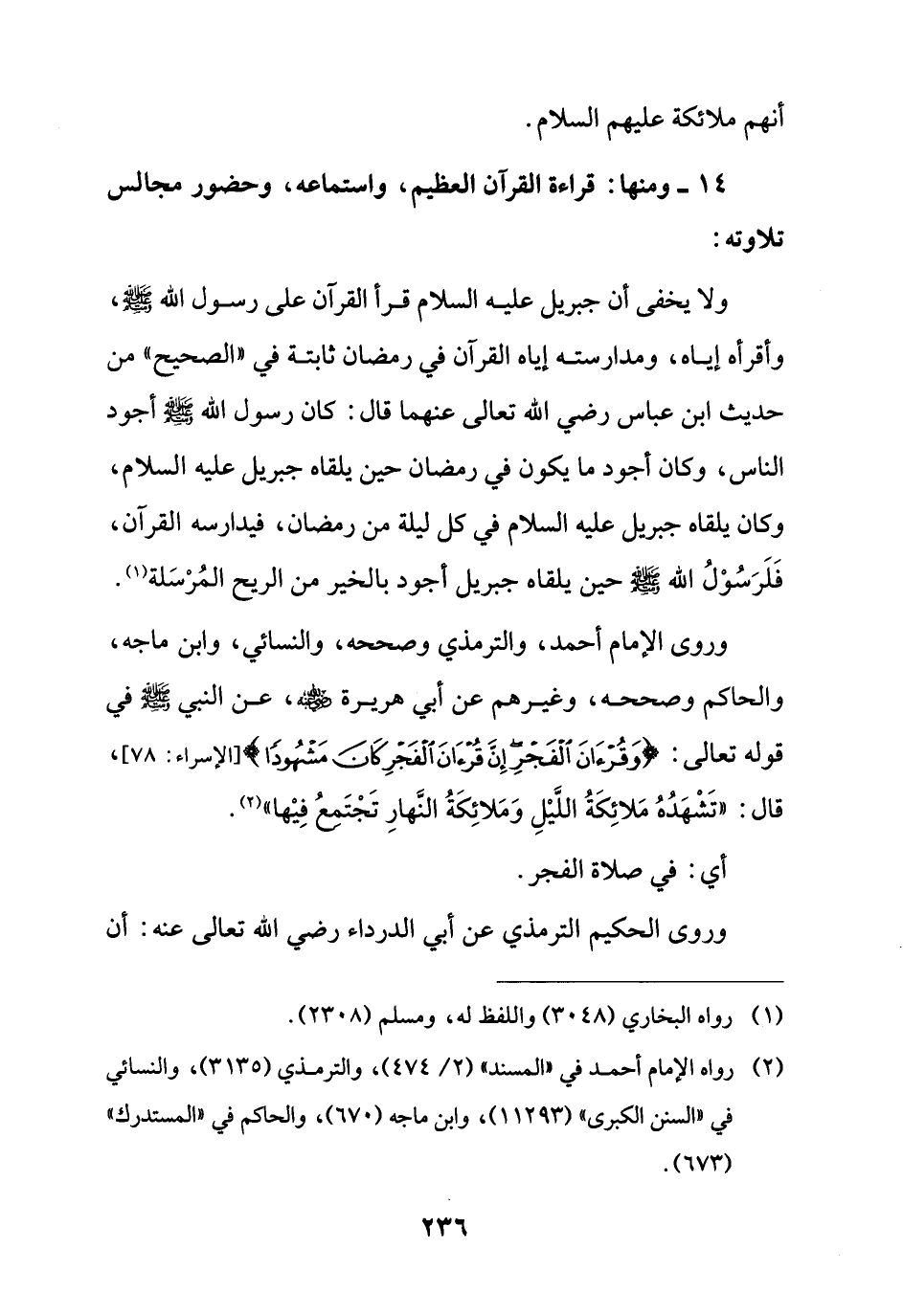 وروى الإِمام أحمد، والترمذي وصححه، والنسائي، وابن ماجه، والحاكم وصححه، وغيرهم عن أبي هريرة - رضي الله عنه -، عن النبي - صلى الله عليه وسلم - في قوله تعالى: {وَقُرْآنَ الْفَجْرِ إِنَّ قُرْآنَ الْفَجْرِ كَانَ مَشْهُودًا} [الإسراء: 78]، قال: "تَشْهَدُهُ مَلائِكَةُ اللَّيْلِ وَمَلائِكَةُ النَّهارِ تَجْتَمعُ فِيْها" (¬2).