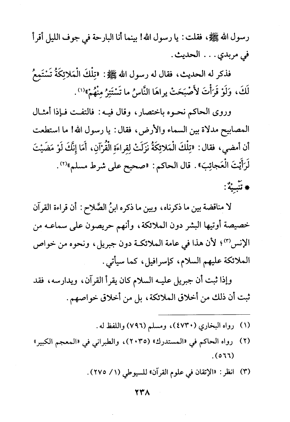 وروى الحاكم نحوه باختصار، وقال فيه: فالتفت فإذا أمثال المصابيح مدلاة بين السماء والأرض، فقال: يا رسول الله! ما استطعت أن أمضي، فقال: "تِلْكَ الْمَلائِكَةُ نزَلَتْ لِقِراءَةِ الْقُرْآنِ، أَمَا إِنَكَ لَوْ مَضَيْتَ لَرَأَيْتَ الْعَجائِبَ". قال الحاكم: "صحيح على شرط مسلم" (¬2).