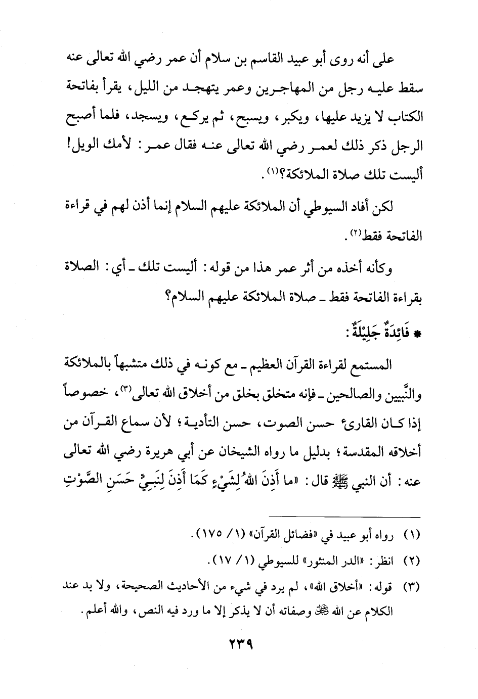 على أنه روى أبو عبيد القاسم بن سلام أن عمر رضي الله تعالى عنه سقط عليه رجل من المهاجرين وعمر يتهجد من الليل، يقرأ بفاتحة الكتاب لا يزيد عليها، ويكبر، ويسبح، ثم يركع، وسجد، فلما أصبح الرجل ذكر ذلك لعمر رضي الله تعالى عنه فقال عمر: لأمك الويل! أليست تلك صلاة الملائكة؟ (¬1).