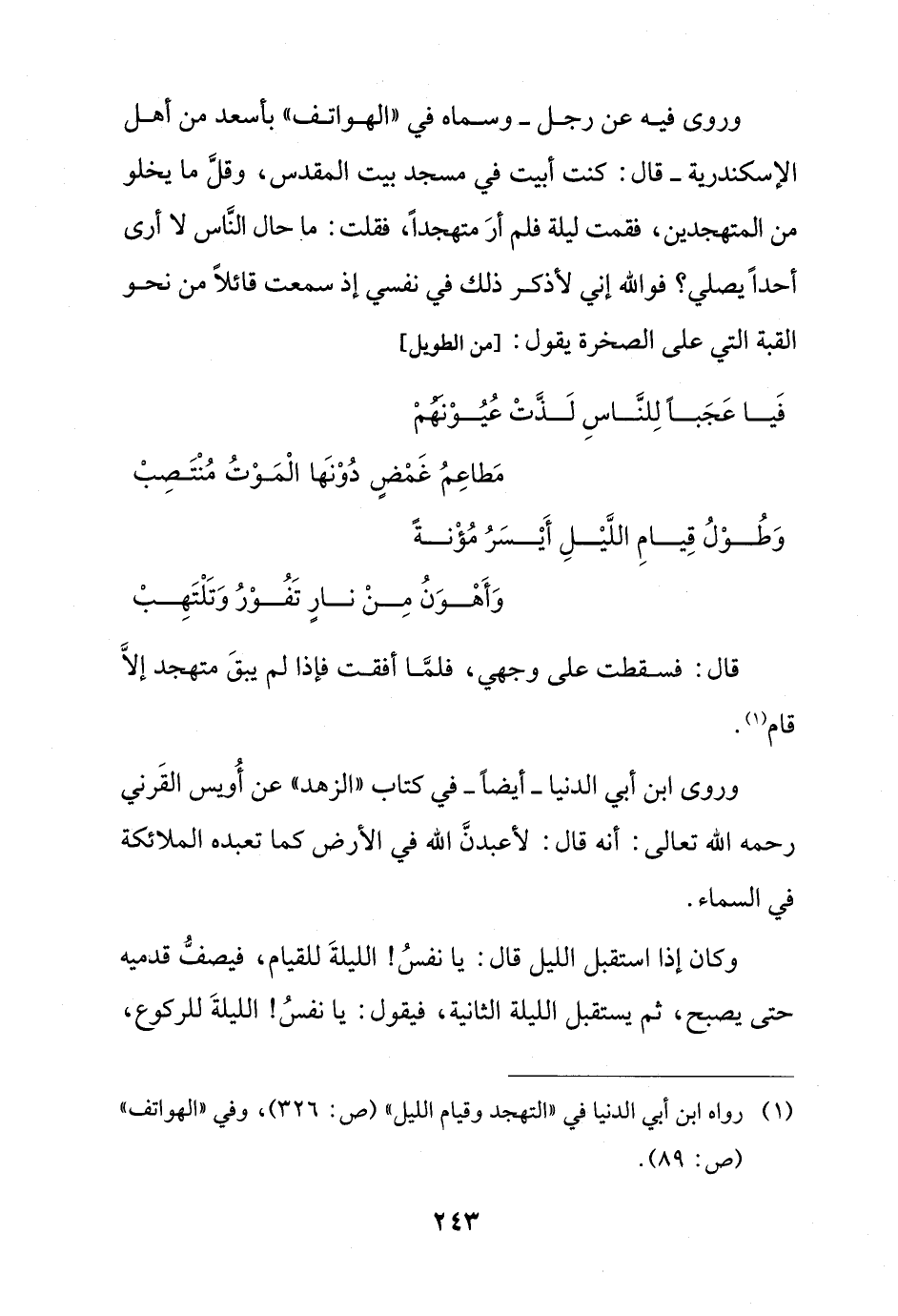 وروى فيه عن رجل -وسماه في "الهواتف" بأسعد من أهل الإسكندرية- قال: كنت أبيت في مسجد بيت المقدس، وقلَّ ما يخلو من المتهجدين، فقمت ليلة فلم أرَ متهجداً، فقلت: ما حال النَّاس لا أرى أحدًا يصلي؟ فوالله إني لأذكر ذلك في نفسي إذ سمعت قائلًا من نحو القبة التي على الصخرة يقول: [من الطويل]