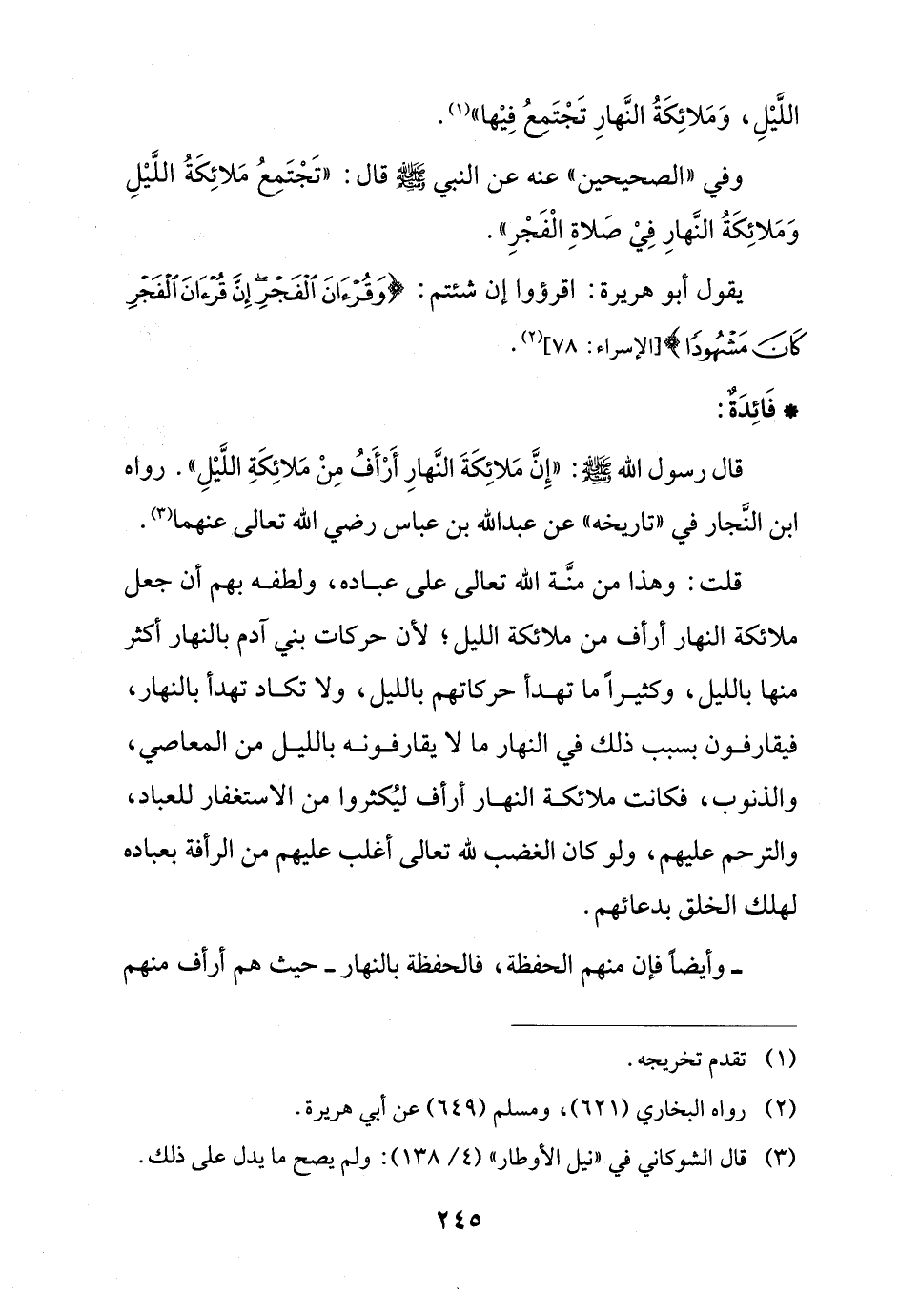 قال رسول الله - صلى الله عليه وسلم -: "إِنَّ مَلائِكَةَ النَّهارِ أَرْأَفُ مِنْ مَلائِكَةِ اللَّيْلِ". رواه ابن النَّجار في "تاريخه" عن عبد الله بن عباس رضي الله تعالى عنهما (¬3).