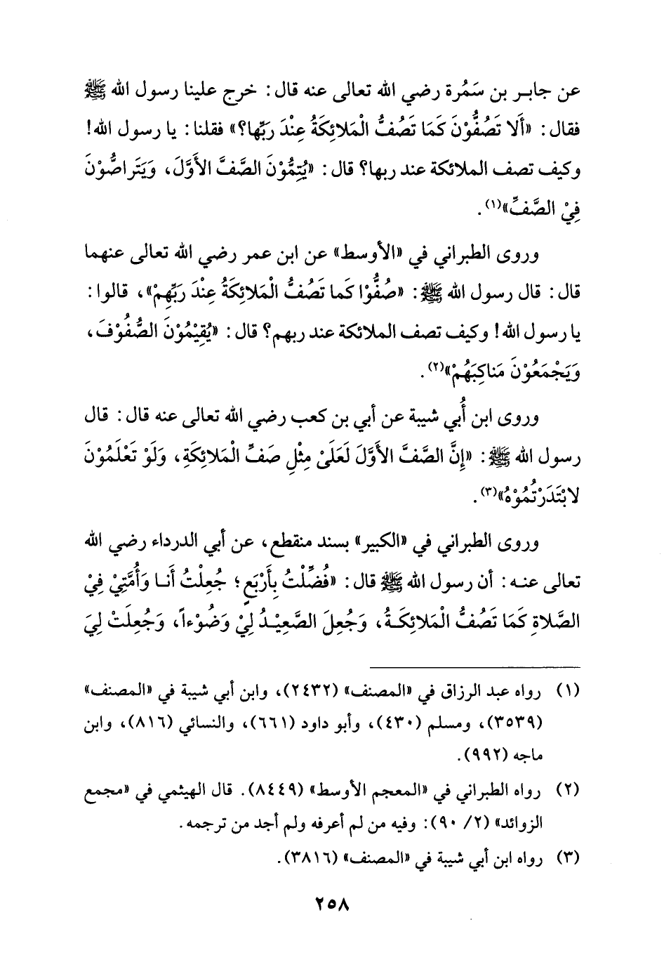 وروى الطبراني في "الكبير" بسند منقطع، عن أبي الدرداء رضي الله تعالى عنه: أن رسول الله - صلى الله عليه وسلم - قال: "فُضلْتُ بِأَرْبَعِ؟ جُعِلْتُ أَنا وَأُمَّتِيْ فِيْ الصَّلاةِ كَمَا تَصُفُّ الْمَلائِكَةُ، وَجُعِلَ الصَّعِيْدُ لِيْ وَضُوْءاً، وَجُعِلَتْ لِيَ