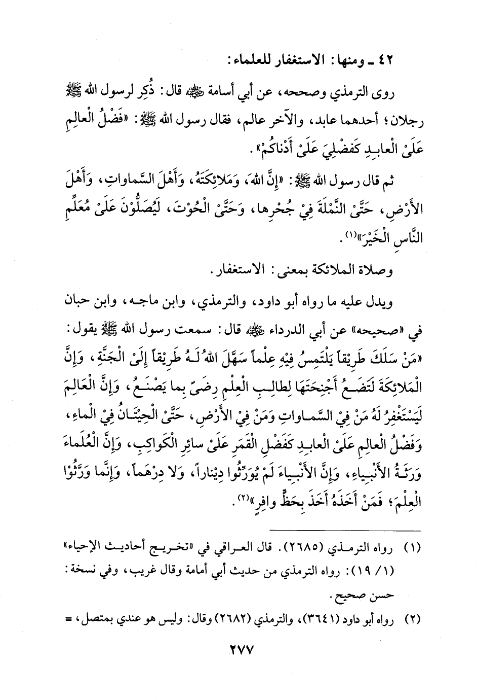 روى الترمذي وصححه، عن أبي أسامة - رضي الله عنه - قال: ذُكِر لرسول الله - صلى الله عليه وسلم - رجلان؛ أحدهما عابد، والآخر عالم، فقال رسول الله - صلى الله عليه وسلم -: "فَضْلُ الْعالِمِ عَلَىْ الْعابِدِ كَفضْلِيَ عَلَىْ أَدْناكُمْ".