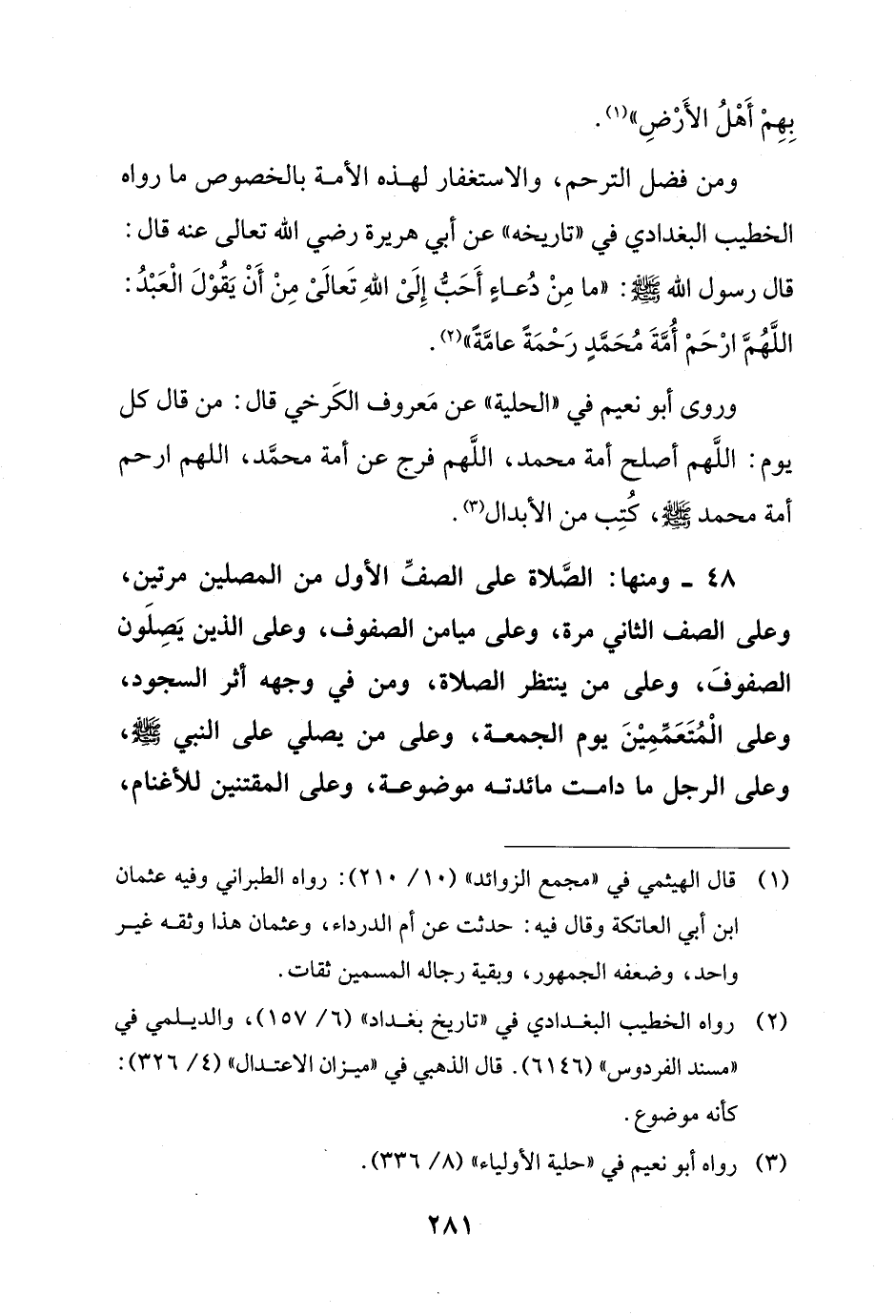 48 - ومنها: الصَّلاة على الصفِّ الأول من المصلين مرتين، وعلى الصف الثاني مرة، وعلى ميامن الصفوف، وعلى الذين يَصِلَون الصفوفَ، وعلى من ينتظر الصلاة، ومن في وجهه أثر السجود، وعلى الْمُتَعَمِّمِيْنَ يوم الجمعة، وعلى من يصلي على النبي - صلى الله عليه وسلم -، وعلى الرجل ما دامت مائدته موضوعة، وعلى المقتنين للأغنام،