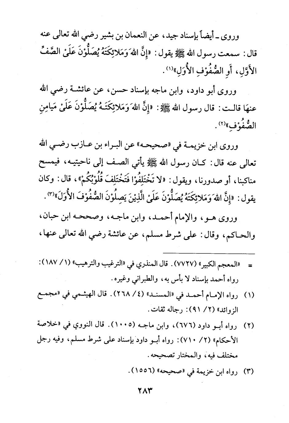 وروى -أيضًا بإسناد جيد، عن النعمان بن بشير رضي الله تعالى عنه قال: سمعت رسول الله - صلى الله عليه وسلم - يقول: "إِنَّ اللهَ وَمَلائِكَتَهُ يُصَلُّوْنَ عَلَىْ الصَّفّ الأَوَّلِ، أَوِ الصُّفُوْفِ الأُوَلِ" (¬1).