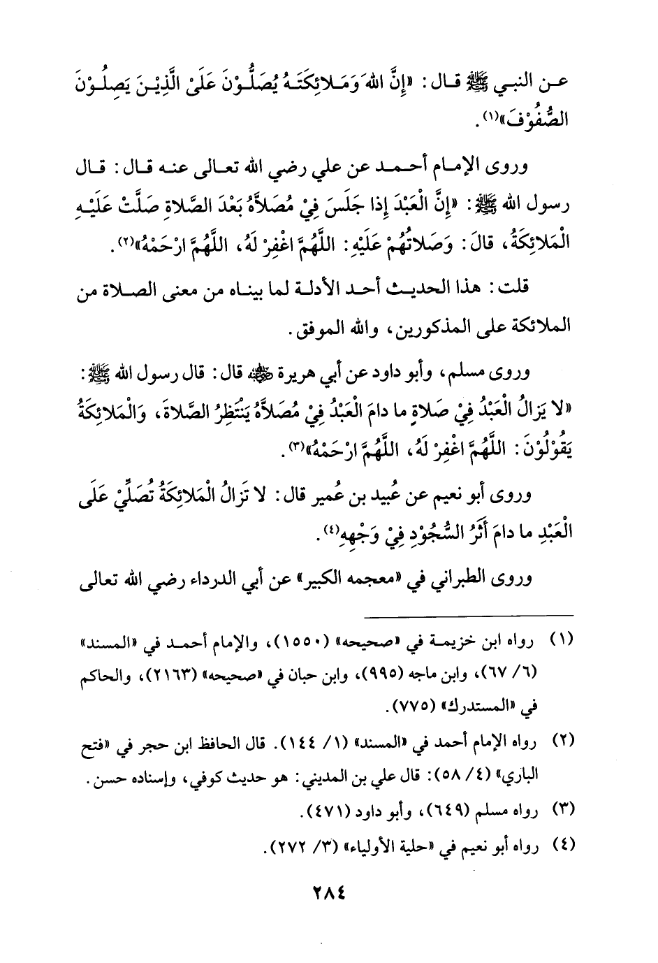 وروى الإِمام أحمد عن علي رضي الله تعالى عنه قال: قال رسول الله - صلى الله عليه وسلم -: "إِنَّ الْعَبْدَ إِذا جَلَسَ فِيْ مُصَلاَّهُ بَعْدَ الصَّلاةِ صَلَّتْ عَلَيْهِ الْمَلائِكَةُ، قالَ: وَصَلاتُهُمْ عَلَيْهِ: اللهُمَّ اغْفِرْ لَهُ، اللهُمَّ ارْحَمْهُ" (¬2).