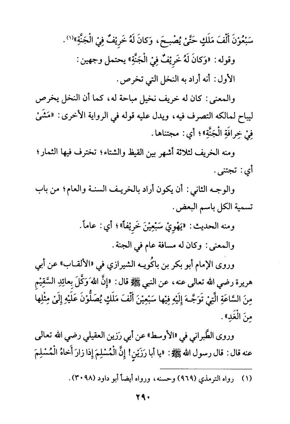 سَبْعُوْنَ ألفَ مَلَكٍ حَتَّىْ يُصْبحَ، وَكانَ لَهُ خَرِيْفٌ فِيْ الْجَنَّةِ" (¬1).