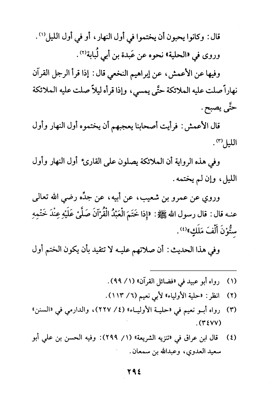وفيها عن الأعمش، عن إبراهيم النخعي قال: إذا قرأ الرجل القرآن نهارًا صلت عليه الملائكة حتَّى يمسي، وإذا قرأه ليلاً صلت عليه الملائكة حتَّى يصبح.