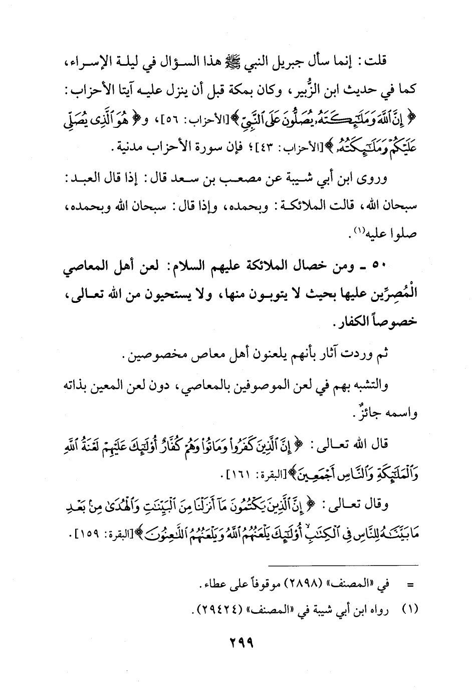 50 - ومن خصال الملائكة عليهم السلام: لعن أهل المعاصي الْمُصِرِّين عليها بحيث لا يتوبون منها, ولا يستحيون من الله تعالى، خصوصاً الكفار.