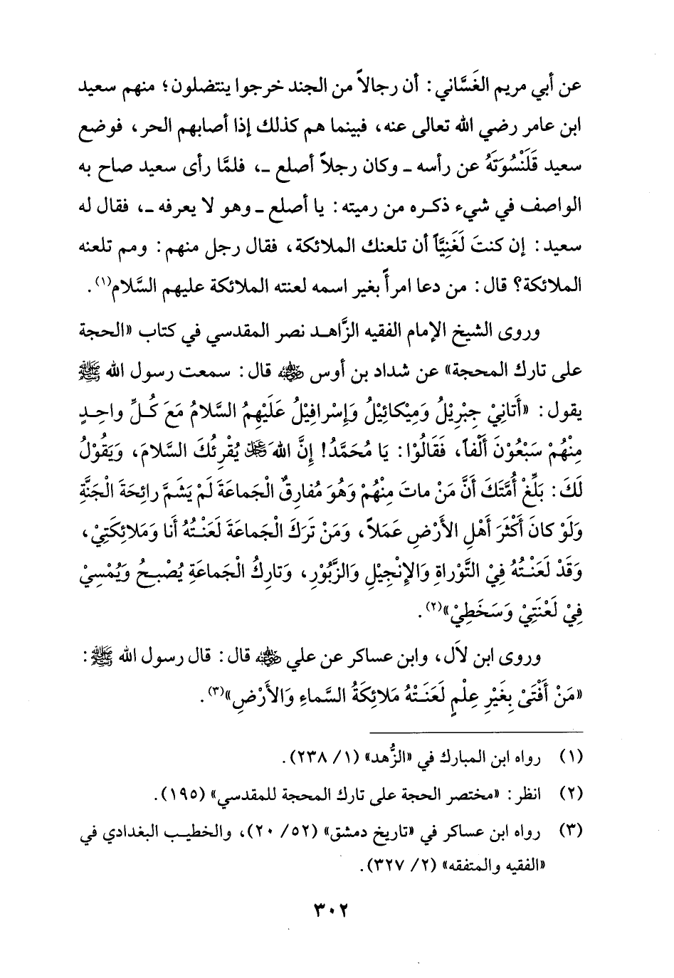 وروى الشيخ الإِمام الفقيه الزاهد نصر المقدسي في كتاب "الحجة على تارك المحجة" عن شداد بن أوس - رضي الله عنه - قال: سمعت رسول الله - صلى الله عليه وسلم - يقول: "أَتانِيْ جبْرِيْلُ وَمِيْكائِيْلُ وَإِسْرافِيْلُ عَلَيْهِمُ السَّلامُ مَعَ كُلِّ واحِدٍ مِنْهُمْ سَبْعُوْنَ ألفًا، فَقَالُوْا: يَا مُحَمَّدُ! إِنَّ الله عز وجل يُقْرِئُكَ السَّلامَ، وَيقُوْلُ لَكَ: بَلِّغْ أُمَّتَكَ أَنَّ مَنْ ماتَ مِنْهُمْ وَهُوَ مُفارِقٌ الْجَماعَةَ لَمْ يَشَمَّ رائِحَةَ الْجَنَّةِ وَلَوْ كانَ أكثَرَ أَهْلِ الأَرْضِ عَمَلاً، وَمَنْ تَرَكَ الْجَماعَةَ لَعَنْتُهُ أَنا وَمَلائِكَتِيْ، وَقَدْ لَعَنْتُهُ فِيْ التَّوْراةِ وَالإِنْجِيْلِ وَالزَّبُوْرِ، وَتارِكُ الْجَماعَةِ يُصْبحُ وُيمْسِيْ فِيْ لَعْنَتِيْ وَسَخَطِيْ" (¬2).