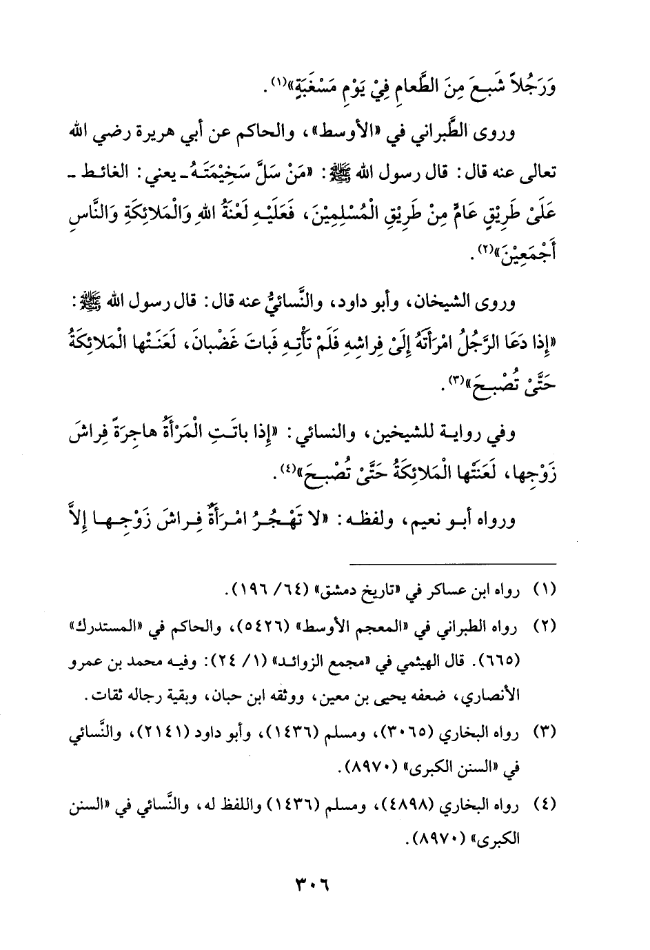 وروى الشيخان، وأبو داود، والنَسائي عنه قال: قال رسول الله - صلى الله عليه وسلم -: "إِذا دَعَا الرَّجُلُ امْرَأتهُ إِلَىْ فِراشِهِ فَلَمْ تأتِهِ فَباتَ غَضْبانَ، لَعَنَتْها الْمَلائِكَةُ حَتَّىْ تُصْبحَ" (¬3).