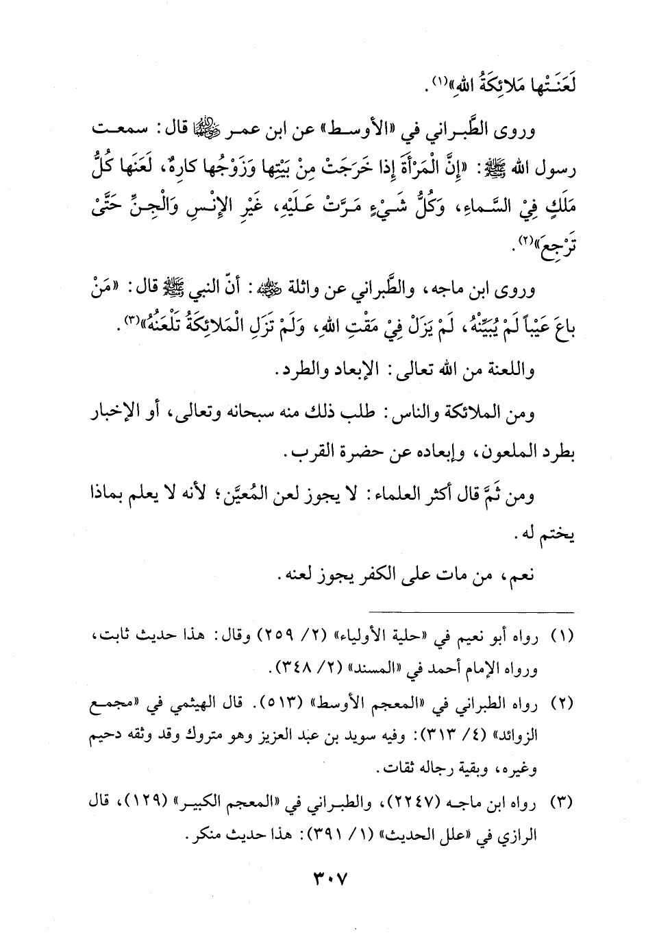 وروى الطبراني في "الأوسط" عن ابن عمر - رضي الله عنهما - قال: سمعت رسول الله - صلى الله عليه وسلم -: "إِنَّ الْمَرْأة إِذا خَرَجَتْ مِنْ بَيْتها وَزَوْجُها كارِهٌ، لَعَنَها كُلُّ مَلَك فِيْ السَّماءِ، وَكُلُّ شَيْء مَرَّتْ عَلَيْهِ، غَيْرِ الإِنْسِ وَالْجِنِّ حَتَّىْ تَرْجِعَ" (¬2).
