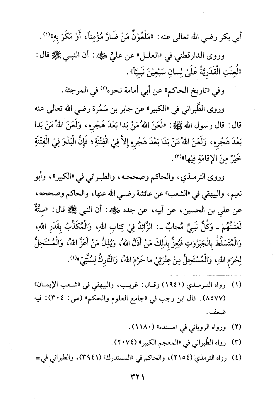وروى الترمذي، والحاكم وصححه، والطبراني في "الكبير"، وأبو نعيم، والبيهقي في "الشعب" عن عائشة رضي الله عنها، والحاكم وصححه، عن علي بن الحسين، عن أبيه، عن جده - رضي الله عنه -: أن النبي - صلى الله عليه وسلم - قال: "سِتَّةٌ لَعَنْتُهُمْ -وَكُلُّ نبَى مُجابٌ -: الزَّائِدُ فِيْ كِتابِ اللهِ، وَالْمُكَذِّبُ بِقَدَرِ اللهِ، وَالْمُتَسَلِّطُ بِالْجَبَرُوْتِ فَيُعِزُّ بِذَلِكَ مَنْ أَذَلَّ اللهُ، وَيُذِلُّ مَنْ أَعَزَّ اللهُ، وَالْمُسْتَحِلُّ لِحُرَمِ الله، وَالْمُسْتَحِلُّ مِنْ عِتْرَتيْ ما حَرَّمَ اللهُ، وَالتَّارِكُ لِسُنَّتِيْ" (¬4).