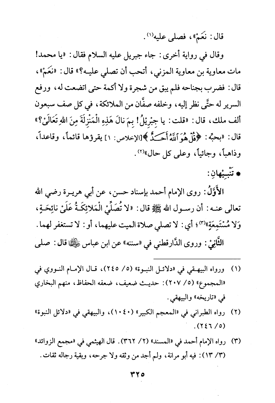 وقال في رواية أخرى: جاء جبريل عليه السلام فقال: "يا محمَّد! مات معاوية بن معاوية المزني، أتحب أن تصلي عليه؟ " قال: "نعَمْ"، قال: فضرب بجناحه فلم يبق من شجرة ولا أكمة حتى اتضعت له، ورفع السرير له حتَّى نظر إليه، وخلفه صفَّان من الملائكة، في كل صف سبعون ألف ملك، قال: "قلت: يا جِبْرِيْلُ! بِمَ نالَ هَذهِ الْمَنْزِلَةَ مِنَ اللهِ تَعَالَىْ؟ " قال: "بحبِّه: {قُلْ هُوَ اللَّهُ أَحَدٌ (1)} [الإخلاص: 1] يقرؤها قائمًا، وقاعداً، وذاهباً، وجائيًا، وعلى كل حال" (¬2).