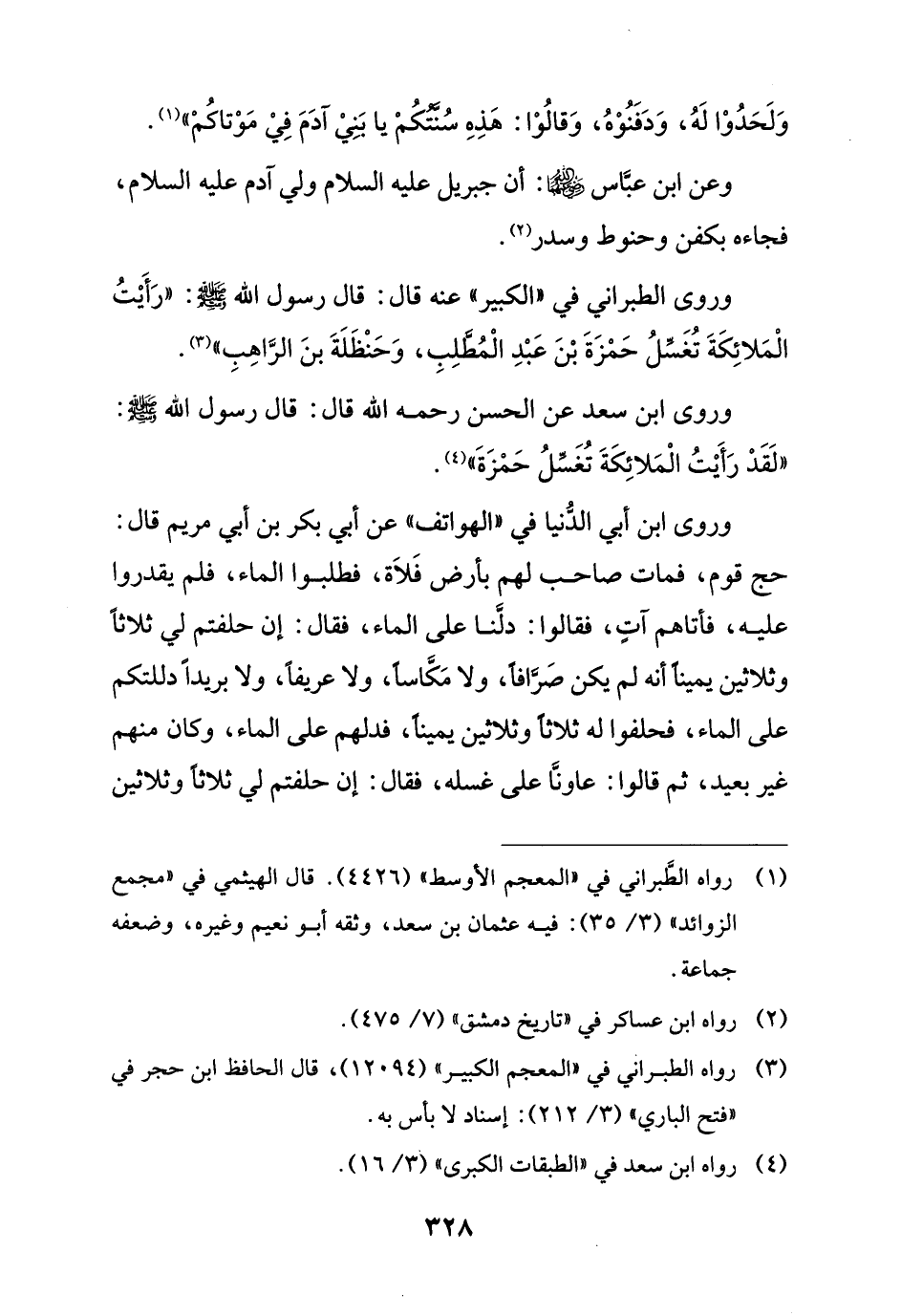 وروى ابن سعد عن الحسن رحمه الله قال: قال رسول الله - صلى الله عليه وسلم -: "لَقَدْ رَأَيْتُ الْمَلائِكَةَ تُغَسِّلُ حَمْزَةَ" (¬4).