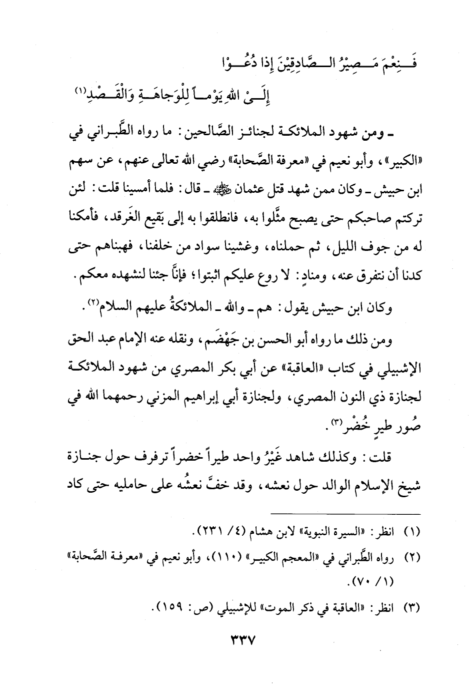 - ومن شهود الملائكة لجنائز الصَّالحين: ما رواه الطَّبراني في "الكبير"، وأبو نعيم في "معرفة الصَّحابة" رضي الله تعالى عنهم، عن سهم ابن حبيش - وكان ممن شهد قتل عثمان - رضي الله عنه - قال: فلما أمسينا قلت: لئن تركتم صاحبكم حتى يصبح مثلوا به، فانطلقوا به إلى بَقيع الغَرقد، فأمكنا له من جوف الليل، ثم حملناه، وغشينا سواد من خلفنا، فهبناهم حتى كدنا أن نتفرق عنه، ومنادٍ: لا روع عليكم اثبتوا؛ فإنَّا جئنا لنشهده معكم.