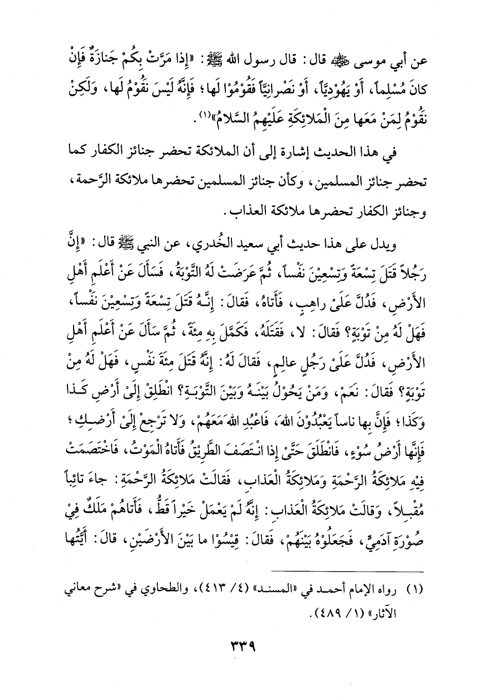 ويدل على هذا حديث أبي سعيد الخُدري، عن النبي - صلى الله عليه وسلم -قال: "إِنَّ رَجُلاً قتَلَ تِسْعَة وَيسْعِيْنَ نَفْساً، ثُمَّ عَرَضَتْ لَهُ التَّوْبَةُ، فَسَأَلَ عَنْ أَعْلَمِ أَهْلِ الأَرْضِ، فَدُلَّ عَلَىْ راهِبٍ، فَأَتاهُ، فَقالَ: إِنَّهُ قَتَلَ تِسْعَةً وَتسْعِيْنَ نَفْساً، فَهَلْ لَهُ مِنْ تَوْبَةٍ؟ فَقالَ: لا، فَقَتَلَهُ، فَكَمَّلَ بِهِ مِئَةً، ثُمَّ سَأَلَ عَنْ أَعْلَمِ أَهْلِ الأَرْضِ، فَدُلَّ عَلَىْ رَجُلٍ عالِمٍ، فَقالَ لَهُ: إِنَّهُ قَتَلَ مِئَةَ نَفْسٍ، فَهَلْ لَهُ مِنْ تَوْبَةٍ؟ فَقالَ: نَعَمْ، وَمَنْ يَحُوْلُ بَيْنَهُ وَبَيْنَ التَّوْبَةِ؟ انْطَلِقْ إِلَىْ أَرْضِ كَذا وَكَذا؟ فَإِنَّ بِها ناساً يَعْبُدُوْنَ اللهَ، فَاعْبُدِ الله مَعَهُمْ، وَلا تَرْجِعْ إِلَىْ أَرْضِكِ؛ فَإِنَّها أَرْضُ سُوءٍ، فَانْطَلَقَ حَتَّىْ إِذا انْتَصَفَ الطَّرِيْقُ فَأَتاهُ الْمَوْتُ، فَاخْتَصَمَتْ فِيْهِ مَلائِكَةُ الرَّحْمَةِ وَمَلائِكَةُ الْعَذابِ، فَقالَتْ مَلائِكَةُ الرَّحْمَةِ: جاءَ تائِباً مُقْبِلاً، وَقالَتْ مَلائِكَةُ الْعَذابِ: إِنَّه لَمْ يَعْمَلْ خَيْراً قَطُّ، فَأَتاهُمْ ملك فِيْ صُوْرَةِ آدمِيٍّ، فَجَعَلُوْهُ بَيْنَهُمْ، فَقالَ: قِيْسُوْا ما بَيْنَ الأَرْضَيْنِ، قالَ: أيُّتُها