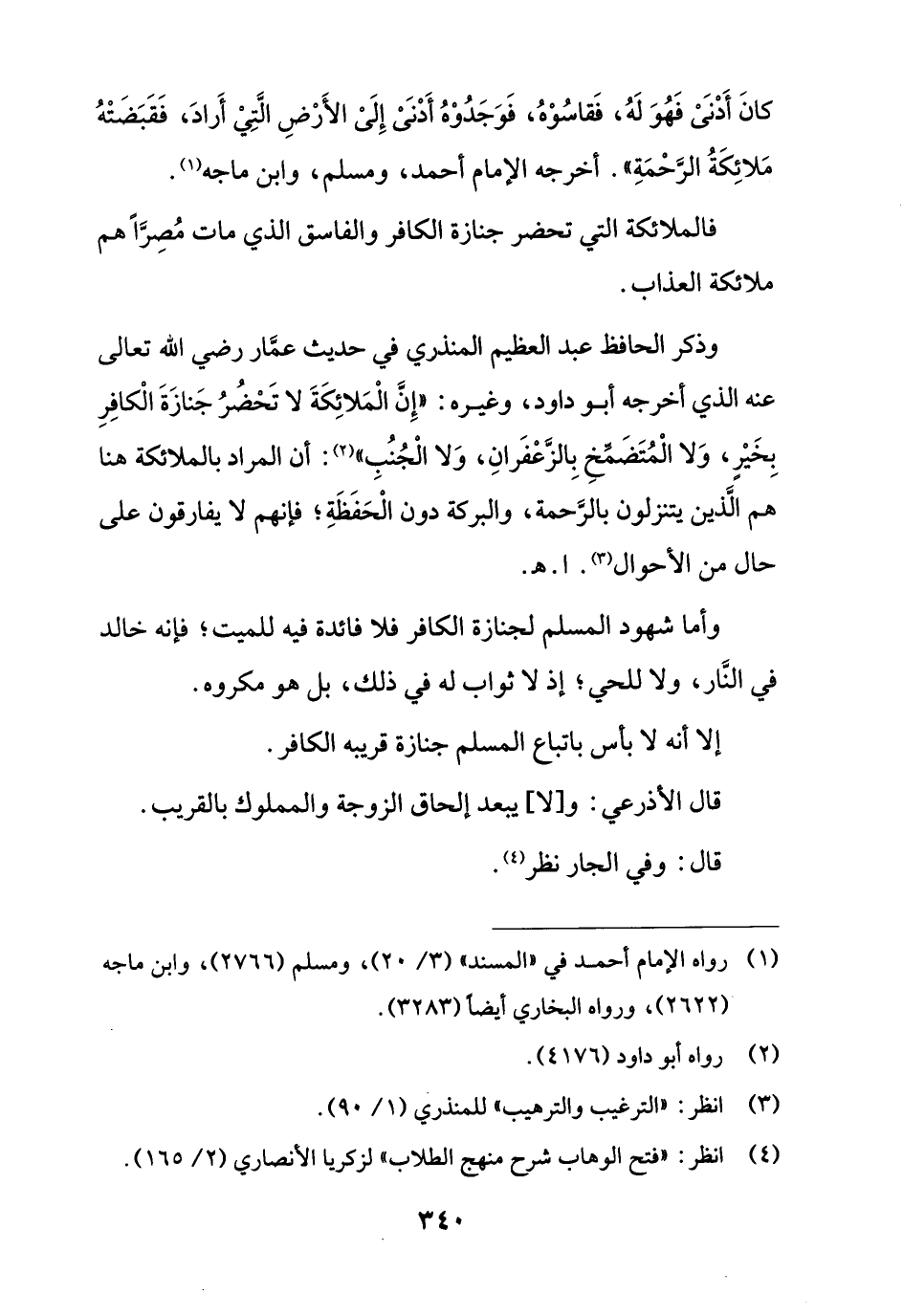 وذكر الحافظ عبد العظيم المنذري في حديث عمار رضي الله تعالى عنه الذي أخرجه أبو داود، وغيره: "إِنَّ الْمَلائِكَةَ لا تَحْضُرُ جَنازَةَ الْكافِرِ بِخَيْرٍ، وَلا الْمُتَضَمِّخِ بِالزعْفَرانِ، وَلا الْجُنُبِ" (¬2): أن المراد بالملائكة هنا هم الَّذين يتنزلون بالرَّحمة، والبركة دون الْحَفَظَةِ؛ فإنهم لا يفارقون على حال من الأحوال (¬3). ا. هـ.