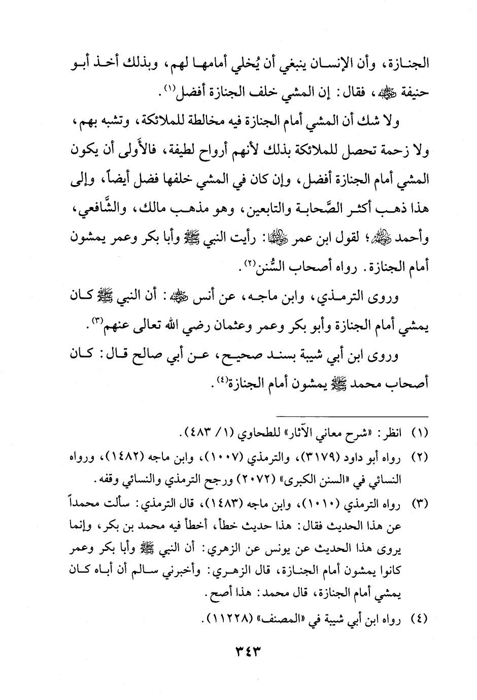 وروى الترمذي، وابن ماجه، عن أنس - رضي الله عنه -: أن النبي - صلى الله عليه وسلم -كان يمشي أمام الجنازة وأبو بكر وعمر وعثمان رضي الله تعالى عنهم (¬3).
