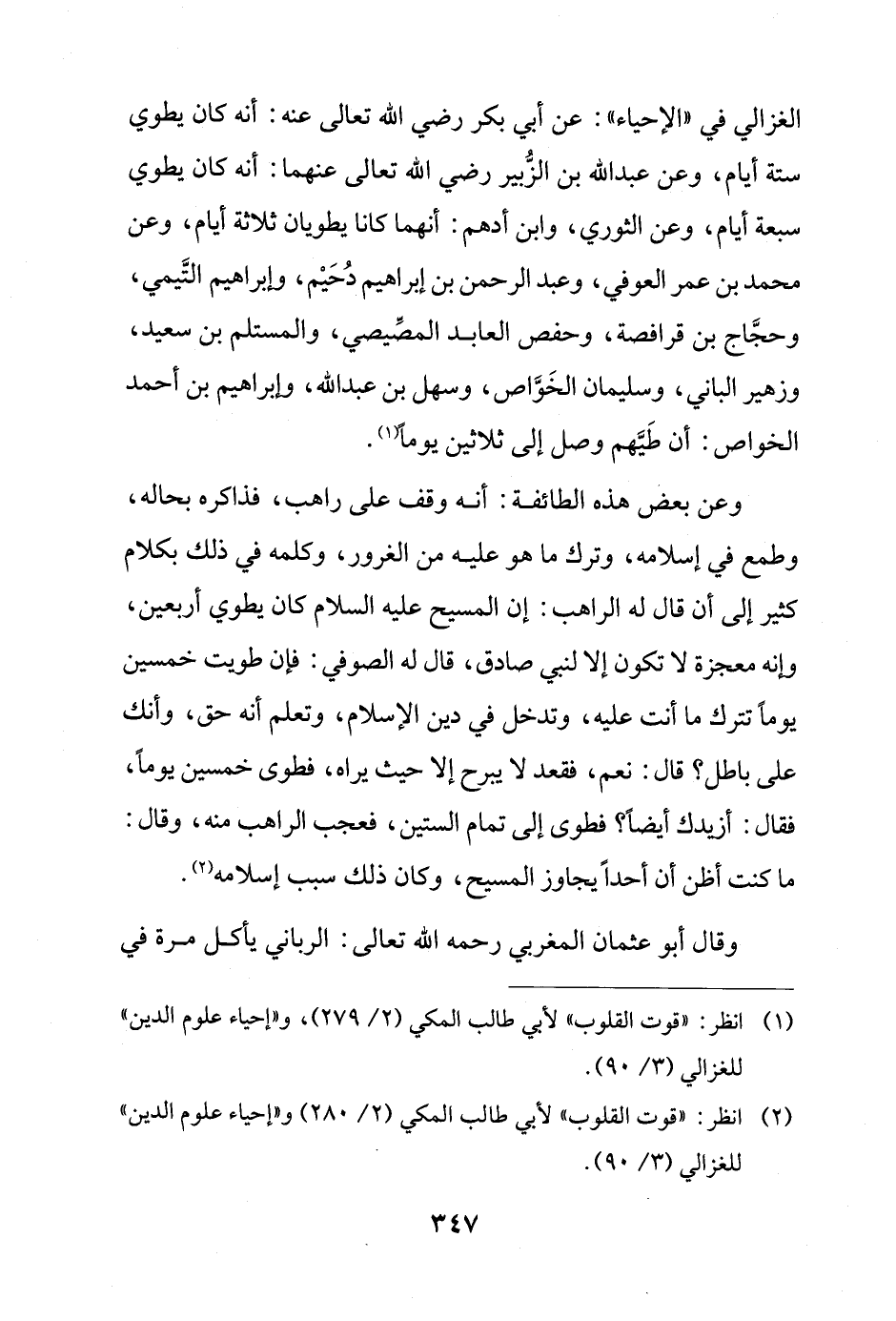 الغزالي في "الإحياء": عن أبي بكر رضي الله تعالى عنه: أنه كان يطوي ستة أيام، وعن عبد الله بن الزُّبير رضي الله تعالى عنهما: أنه كان يطوي سبعة أيام، وعن الثوري، وابن أدهم: أنهما كانا يطويان ثلاثة أيام، وعن محمد بن عمر العوفي، وعبد الرحمن بن إبراهيم دُحَيْم، وإبراهيم التَّيمي، وحجَّاج بن قرافصة، وحفص العابد المصِّيصي، والمستلم بن سعيد، وزهير الباني، وسليمان الخَوَّاص، وسهل بن عبد الله، وإبراهيم بن أحمد الخواص: أن طَيَّهم وصل إلى ثلاثين يومًا (¬1).