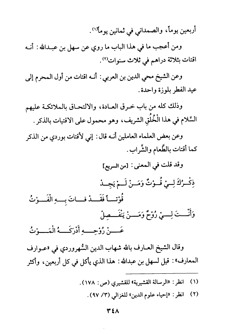 وقال الشيخ العارف بالله شهاب الدين السُّهروردي في "عوارف المعارف": قيل لسهل بن عبد الله: هذا الذي يأكل في كل أربعين، وأكثر