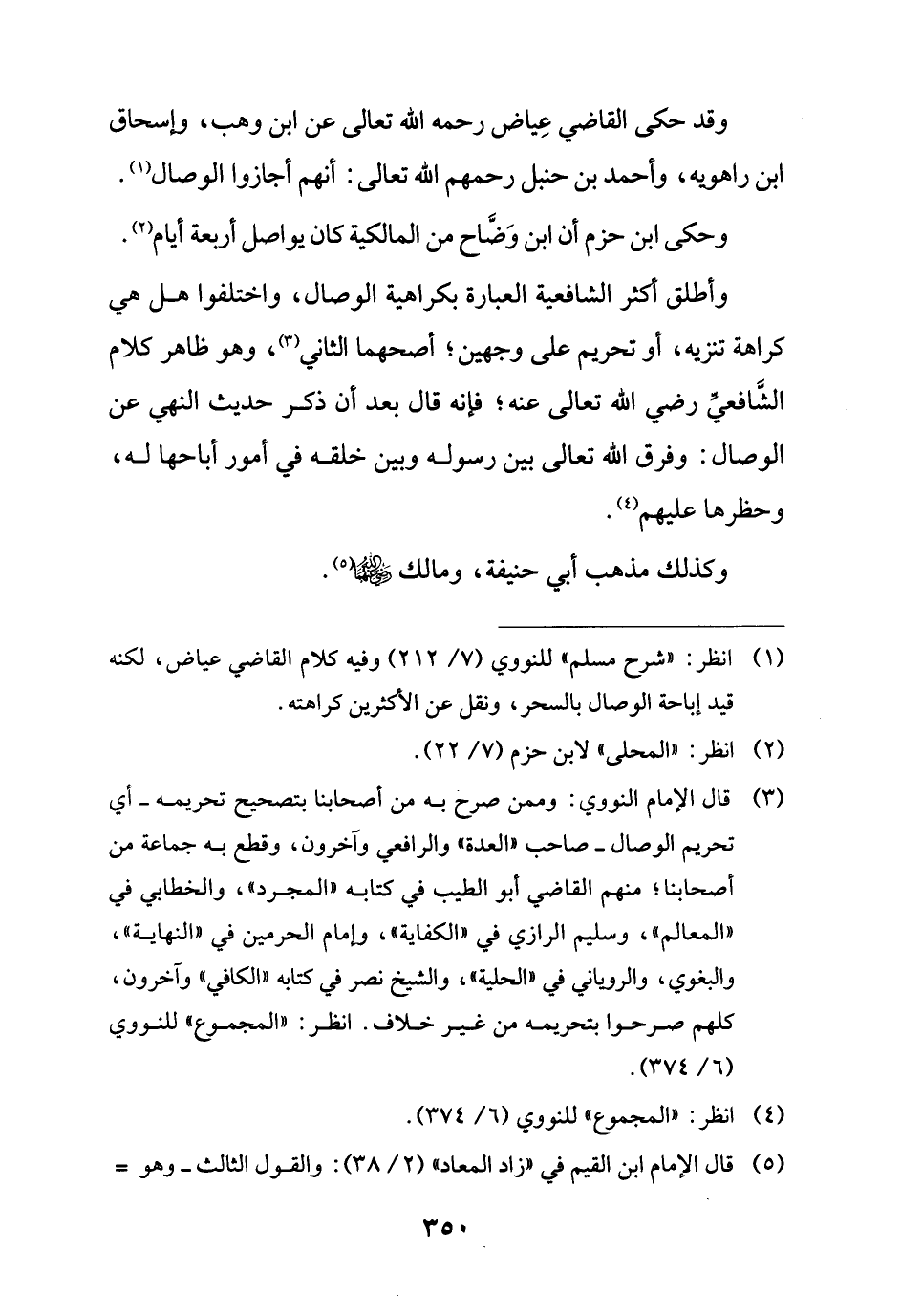 (¬3) قال الإمام النووي: وممن صرح به من أصحابنا بتصحيح تحريمه - أي تحريم الوصال - صاحب "العدة" والرافعي وآخرون، وقطع به جماعة من أصحابنا؛ منهم القاضي أبو الطيب في كتابه "المجرد"، والخطابي في "المعالم"، وسليم الرازي في "الكفاية"، وإمام الحرمين في "النهاية"، والبغوي، والروياني في "الحلية"، والشيخ نصر في كتابه "الكافي" وآخرون، كلهم صرحوا بتحريمه من غير خلاف. انظر: "المجموع" للنووي (6/ 374).