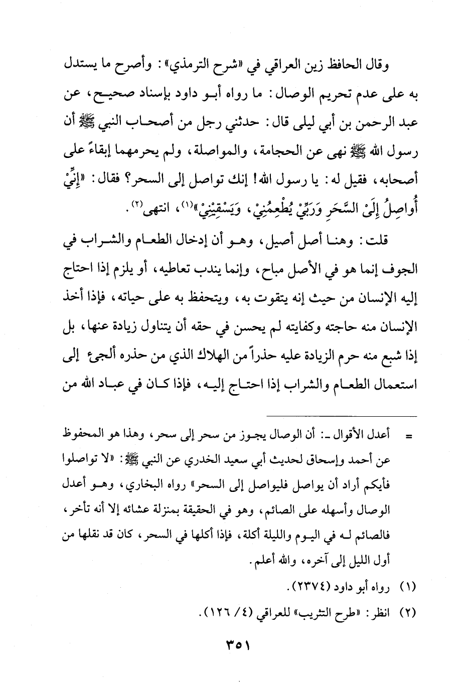 وقال الحافظ زين العراقي في "شرح الترمذي": وأصرح ما يستدل به على عدم تحريم الوصال: ما رواه أبو داود بإسناد صحيح، عن عبد الرحمن بن أبي ليلى قال: حدثني رجل من أصحاب النبي - صلى الله عليه وسلم - أن رسول الله - صلى الله عليه وسلم - نهى عن الحجامة، والمواصلة، ولم يحرمهما إبقاءً على أصحابه، فقيل له: يا رسول الله! إنك تواصل إلى السحر؟ فقال: "إِنِّي أُواصِلُ إِلَىْ السَّحَرِ وَرَبِّي يُطْعِمُنِيْ، وَيَسْقِيْنِيْ" (¬1)، انتهى (¬2).
