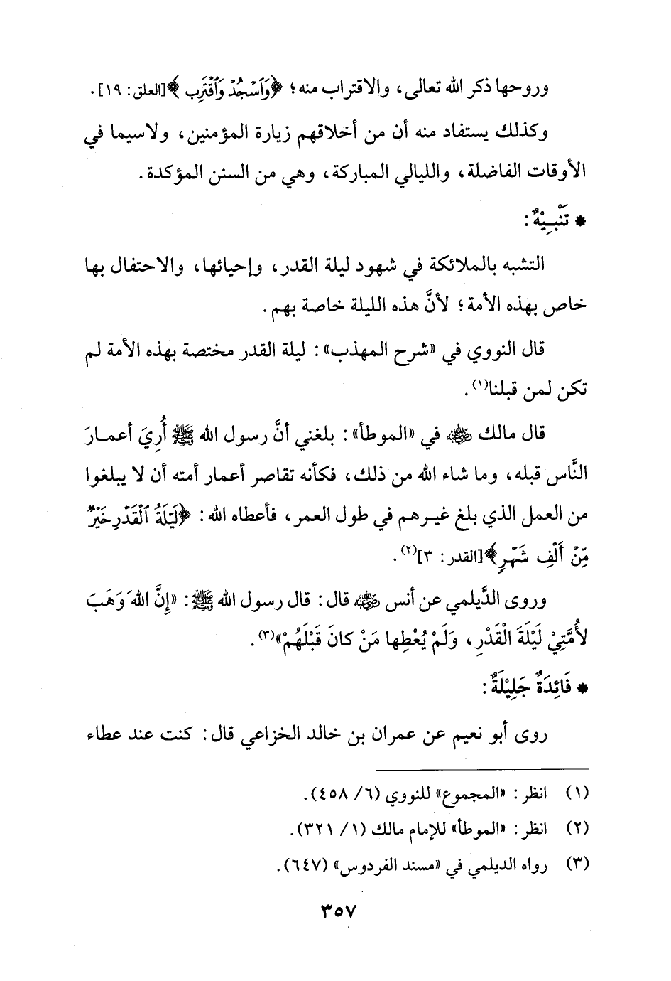 قال مالك - رضي الله عنه - في "الموطأ": بلغني أنَّ رسول الله - صلى الله عليه وسلم - أُرِيَ أعمارَ النَّاس قبله، وما شاء الله من ذلك، فكأنه تقاصر أعمار أمته أن لا يبلغوا من العمل الذي بلغ غيرهم في طول العمر، فأعطاه الله: {خَيْرٌ مِنْ أَلْفِ شَهْرٍ} [القدر: 3] (¬2). وروى الدَّيلمي عن أنس - رضي الله عنه - قال: قال رسول الله - صلى الله عليه وسلم -: "إِنَّ اللهَ وَهَبَ لأُمَّتِيْ لَيْلَةَ الْقَدْرِ، وَلَمْ يُعْطِها مَنْ كانَ قَبْلَهُمْ" (¬3).