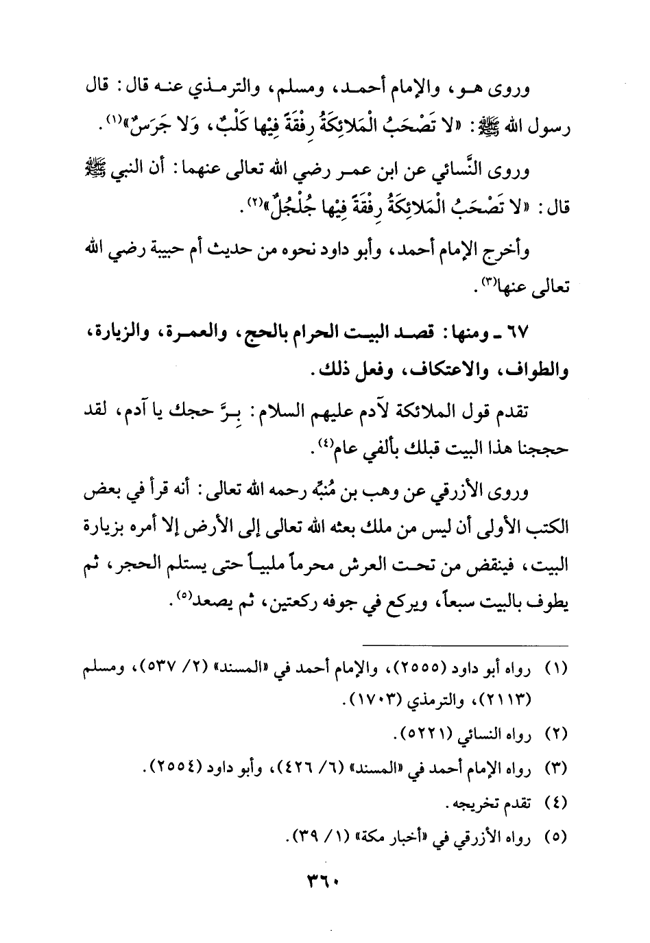 وروى هو، والإمام أحمد، ومسلم، والترمذي عنه قال: قال رسول الله - صلى الله عليه وسلم -: "لا تَصْحَبُ الْمَلائِكَةُ رِفْقَةً فِيْها كَلْبٌ، وَلا جَرَسٌ" (¬1). وروى النَّسائي عن ابن عمر رضي الله تعالى عنهما: أن النبي - صلى الله عليه وسلم - قال: "لا تَصْحَبُ الْمَلائِكَةُ رِفْقَةً فِيْها جُلْجُلٌ" (¬2).