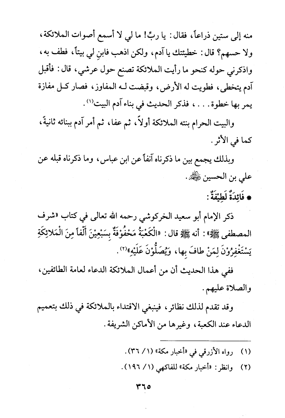 ذكر الإمام أبو سعيد الخركوشي رحمه الله تعالى في كتاب "شرف المصطفى - صلى الله عليه وسلم -": أنه - صلى الله عليه وسلم - قال: "الْكَعْبَةُ مَحْفُوْفَةٌ بِسَبْعِيْنَ أَلفاً مِنَ الْمَلائِكَةِ يَسْتَغْفِرُوْنَ لِمَنْ طافَ بِها، وَيُصَلُّوْنَ عَلَيْهِ" (¬2).
