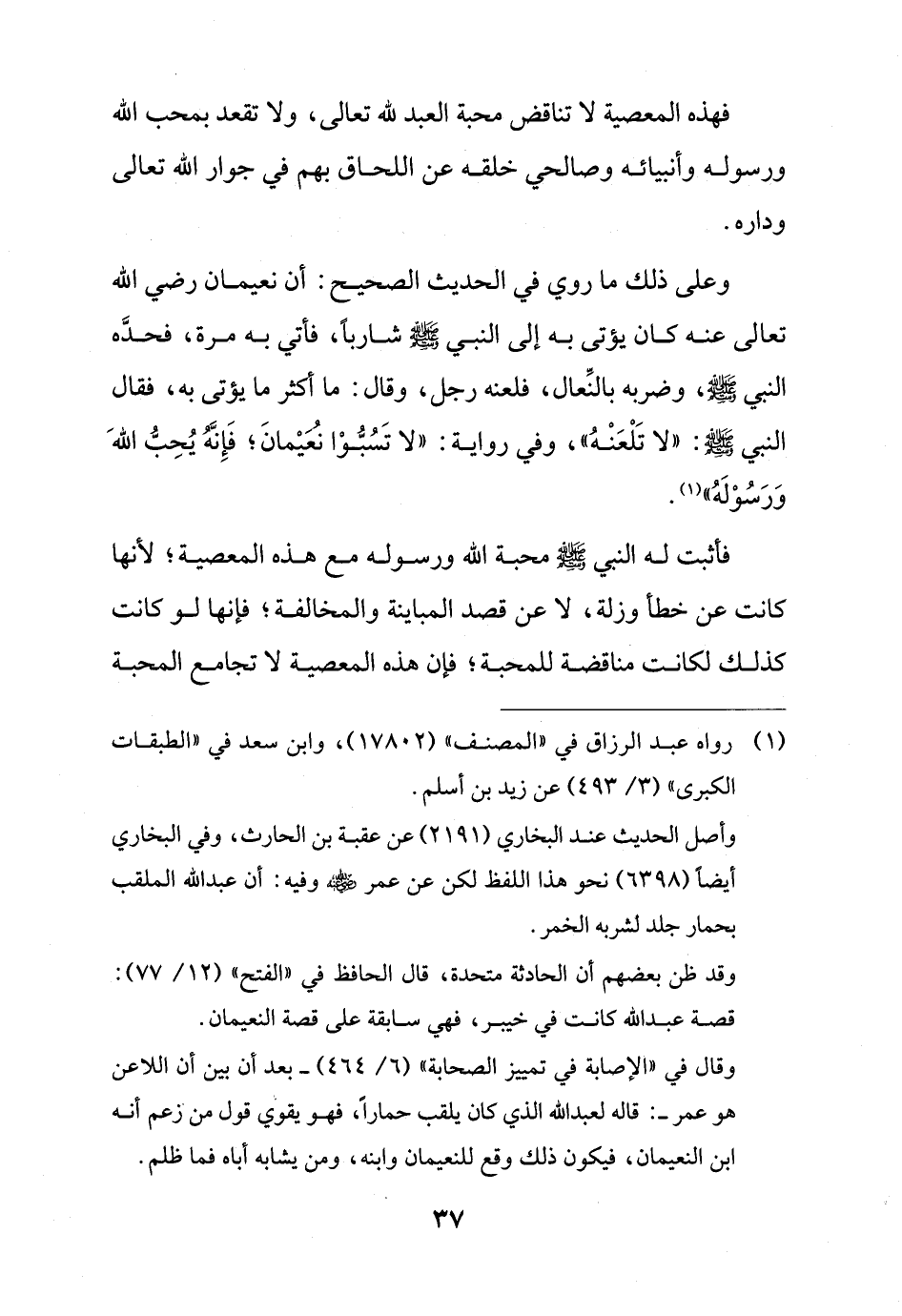 تعالى عنه كان يؤتى به إلى النبي - صلى الله عليه وسلم - شارباً، فأتي به مرة، فحدَّه النبي - صلى الله عليه وسلم -، وضربه بالنِّعال، فلعنه رجل، وقال: ما أكثر ما يؤتى به، فقال النبي - صلى الله عليه وسلم -: "لا تَلْعَنْهُ"، وفي رواية: "لا تَسُبُّوْا نُعيْمانَ؛ فَإِنَّهُ يُحِبُّ اللهَ وَرَسُوْلَهُ" (¬1).