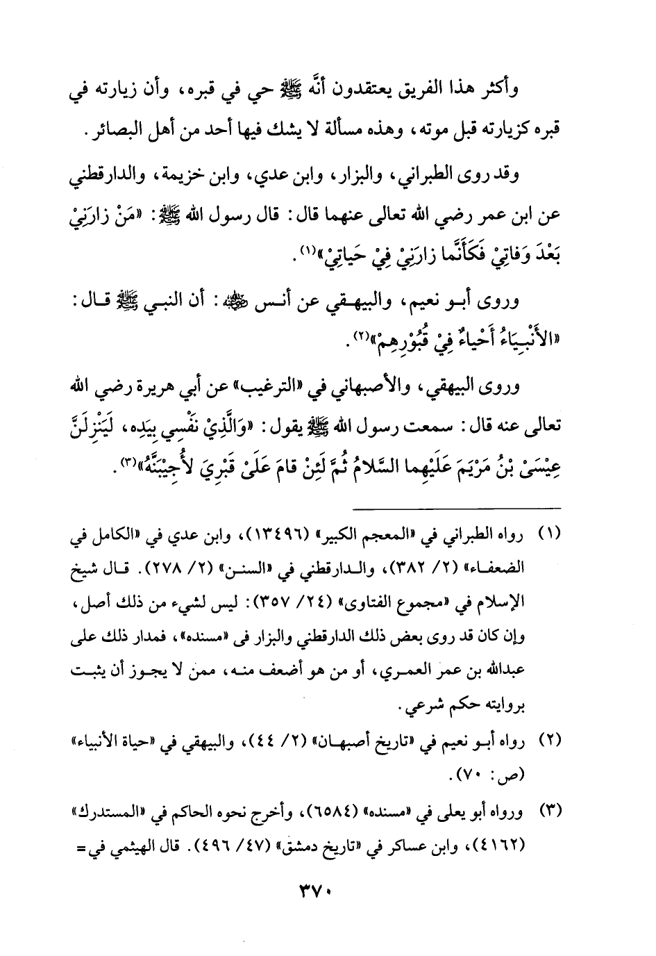 وقد روى الطبراني، والبزار، وابن عدي، وابن خزيمة، والدارقطني عن ابن عمر رضي الله تعالى عنهما قال: قال رسول الله - صلى الله عليه وسلم -: "مَنْ زارَنِيْ بَعْدَ وَفاتِيْ فَكَأَنَّما زارَنِيْ فِيْ حَياتِيْ" (¬1).