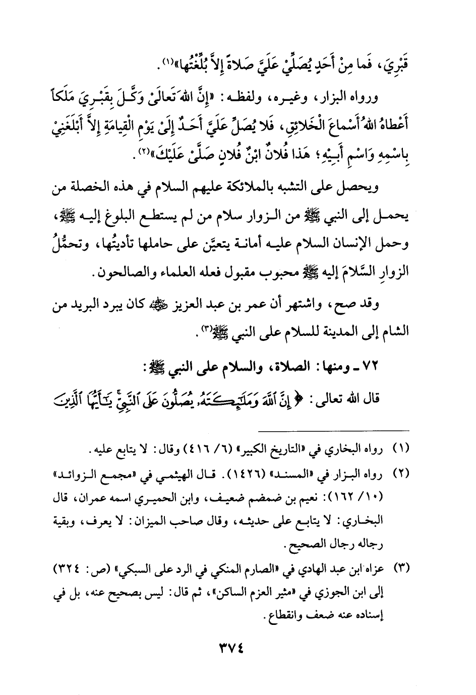 72 - ومنها: الصلاة، والسلام على النبي - صلى الله عليه وسلم -: قال الله تعالى: {إِنَّ اللَّهَ وَمَلَائِكَتَهُ يُصَلُّونَ عَلَى النَّبِيِّ يَا أَيُّهَا الَّذِينَ
