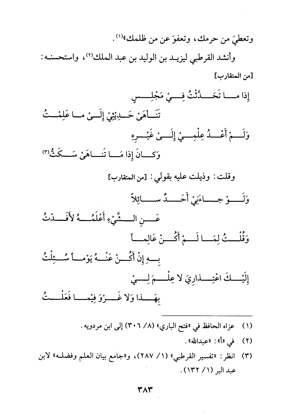 وَلَمْ أَعْدُ عِلْمِيْ إِلَىْ غَيْرِهِ ... وَكانَ إِذا مَا تَناهَىْ سَكَتُّ (¬3)