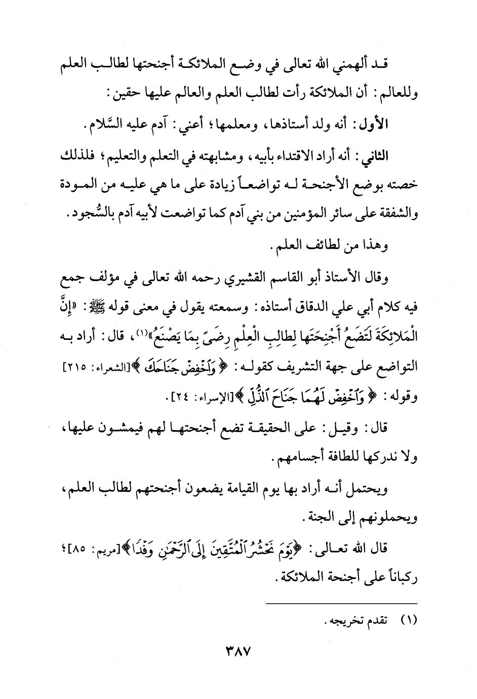 وقال الأستاذ أبو القاسم القشيري رحمه الله تعالى في مؤلف جمع فيه كلام أبي علي الدقاق أستاذه: وسمعته يقول في معنى قوله - صلى الله عليه وسلم -: "إِنَّ الْمَلائِكَةَ لَتَضَعُ أَجْنِحَتَها لِطالِبِ الْعِلْمِ رِضًى بِمَا يَصْنَعُ" (¬1)، قال: أراد به التواضع على جهة التشريف كقوله: {وَاخْفِضْ جَنَاحَكَ} [الشعراء: 215] وقوله: {وَاخْفِضْ لَهُمَا جَنَاحَ الذُّلِّ} [الإسراء: 24].