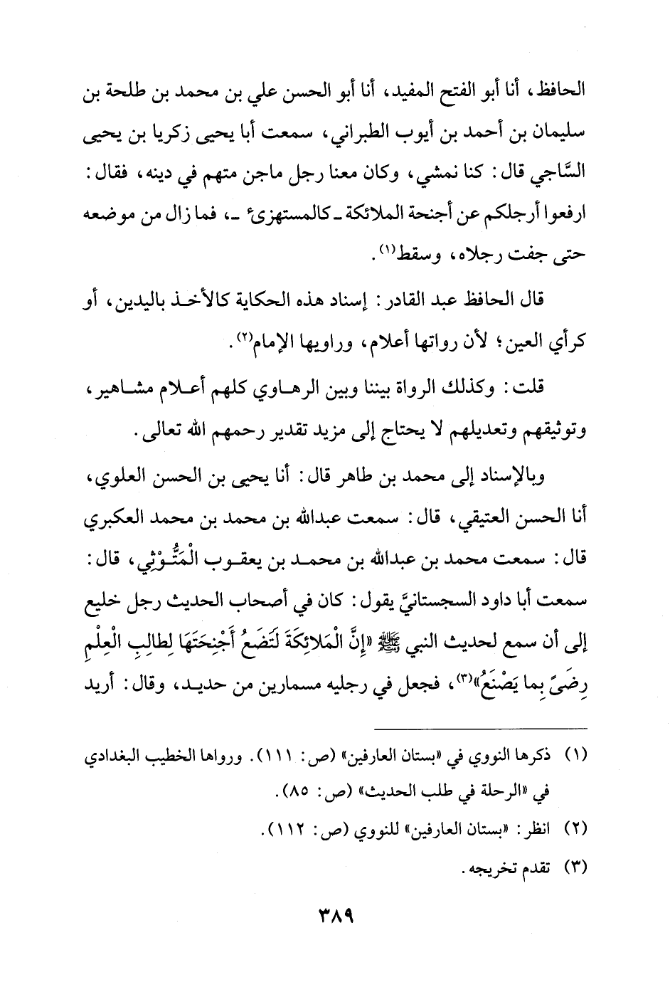 وبالإسناد إلى محمد بن طاهر قال: أنا يحيى بن الحسن العلوي، أنا الحسن العتيقي، قال: سمعت عبد الله بن محمد بن محمد العكبري قال: سمعت محمد بن عبد الله بن محمد بن يعقوب الْمَتُّوْثِي، قال: سمعت أبا داود السجستانيَّ يقول: كان في أصحاب الحديث رجل خليع إلى أن سمع لحديث النبي - صلى الله عليه وسلم - "إِنَّ الْمَلائِكَةَ لَتَضَعُ أَجْنِحَتَهَا لِطالِبِ الْعِلْمِ رِضًى بِما يَصْنعُ" (¬3)، فجعل في رجليه مسمارين من حديد، وقال: أريد