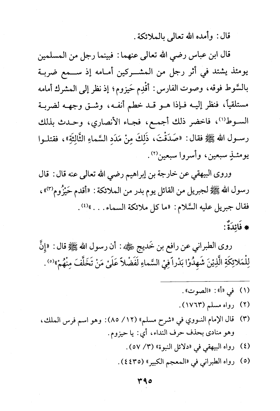 وروى البيهقي عن خارجة بن إبراهيم رضي الله تعالى عنه قال: قال رسول الله - صلى الله عليه وسلم - لجبريل من القائل يوم بدر من الملائكة: "أقدم حَيْزُوم (¬3) "، فقال جبريل عليه السَّلام: "ما كل ملائكة السماء ... " (¬4).