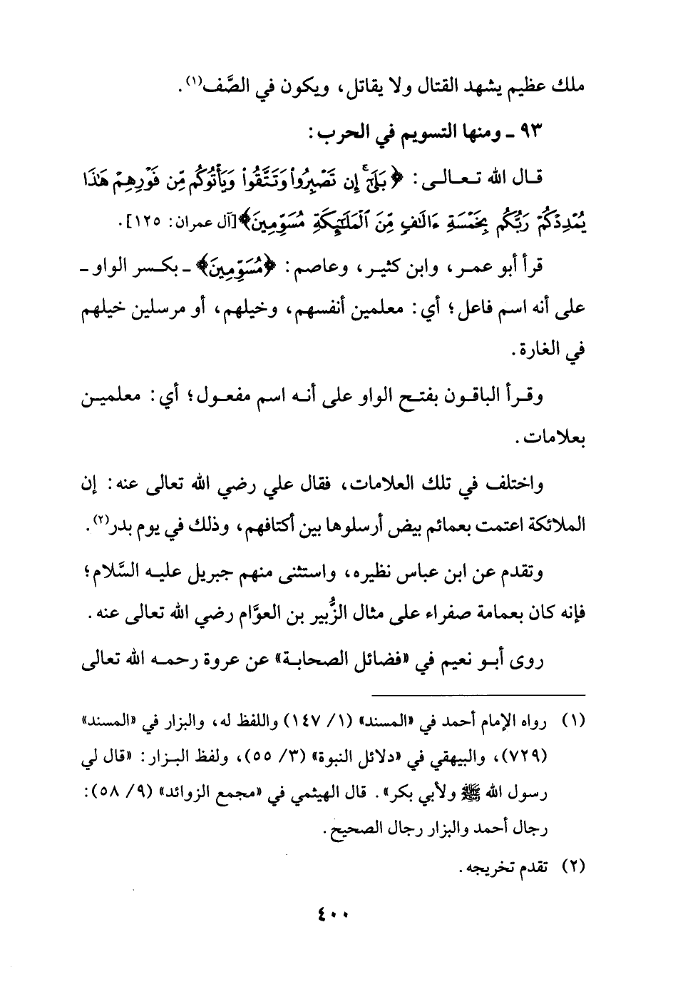 واختلف في تلك العلامات، فقال علي رضي الله تعالى عنه: إن الملائكة اعتمت بعمائم بيض أرسلوها بين أكتافهم، وذلك في يوم بدر (¬2).