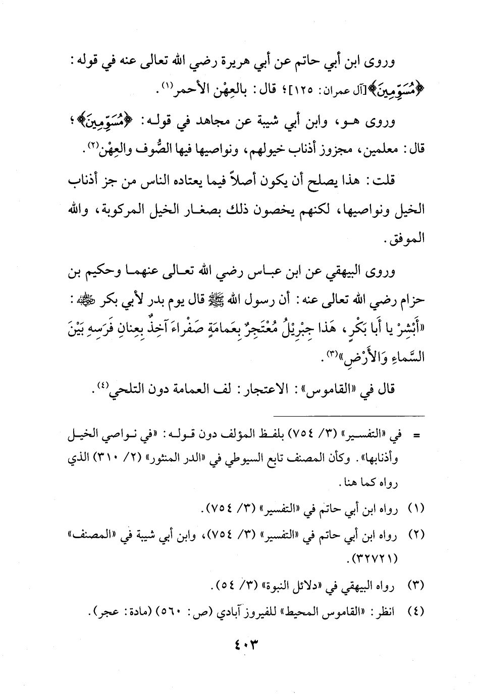 وروى ابن أبي حاتم عن أبي هريرة رضي الله تعالى عنه في قوله: {مُسَوِّمِينَ} [آل عمران: 125]؛ قال: بالعِهْن الأحمر (¬1).