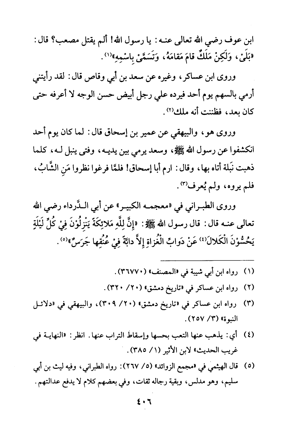 وروى ابن عساكر، وغيره عن سعد بن أبي وقاص قال: لقد رأيتني أرمي بالسهم يوم أحد فيرده علي رجل أبيض حسن الوجه لا أعرفه حتى كان بعد، فظننت أنه ملك (¬2).