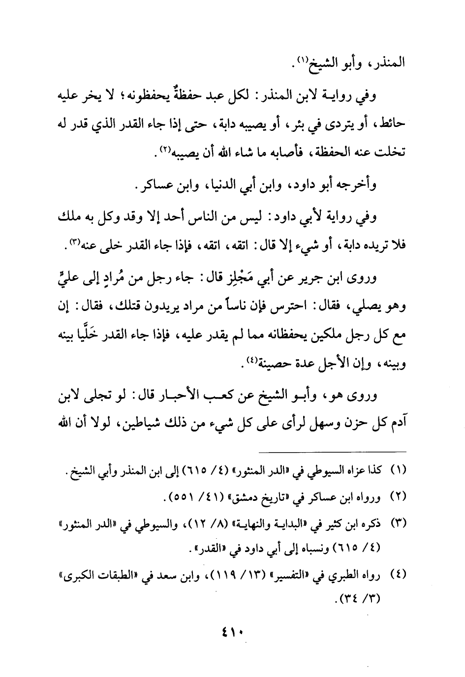 وروى ابن جرير عن أبي مَجْلِز قال: جاء رجل من مُراب إلى عليٍّ وهو يصلي، فقال: احترس فإن ناساً من مراد يريدون قتلك، فقال: إن مع كل رجل ملكين يحفظانه مما لم يقدر عليه، فإذا جاء القدر خَلَّيا بينه وبينه، وإن الأجل عدة حصينة (¬4).
