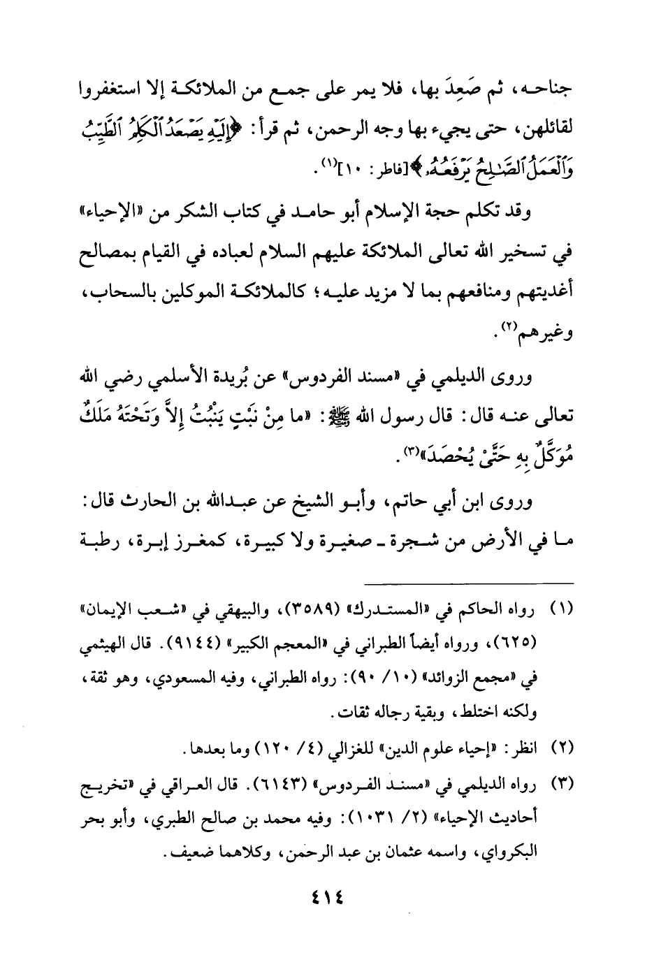 وقد تكلم حجة الإسلام أبو حامد في كتاب الشكر من "الإحياء" في تسخير الله تعالى الملائكة عليهم السلام لعباده في القيام بمصالح أغديتهم ومنافعهم بما لا مزيد عليه؛ كالملائكة الموكلين بالسحاب، وغيرهم (¬2).