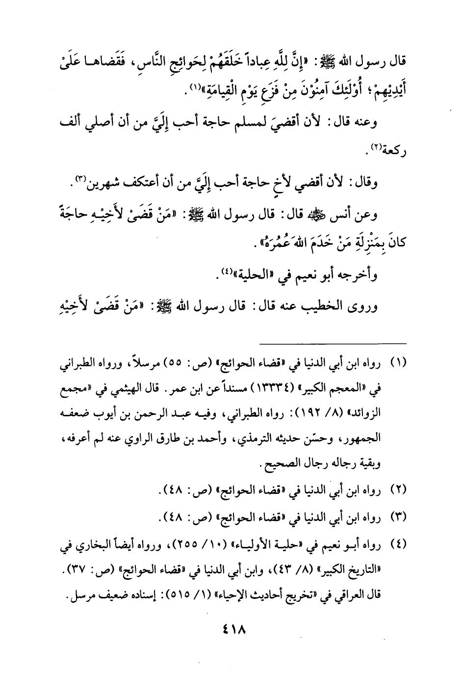 (¬4) رواه أبو نعيم في "حلية الأولياء" (10/ 255)، ورواه أيضاً البخاري في "التاريخ الكبير" (8/ 43)، وابن أبي الدنيا في "قضاء الحوائج" (ص: 37). قال العراقي في "تخريج أحاديث الإحياء" (1/ 515): إسناده ضعيف مرسل.