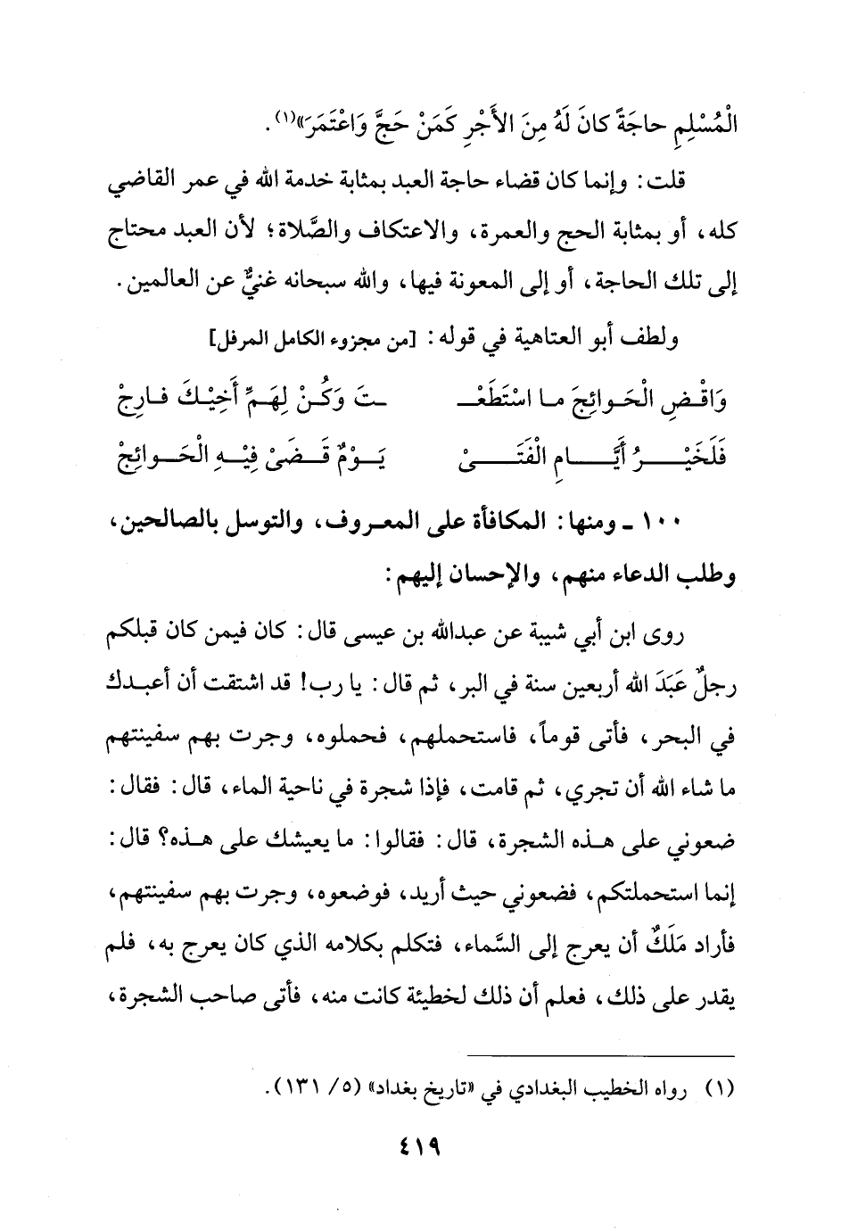 100 - ومنها: المكافأة على المعروف، والتوسل بالصالحين، وطلب الدعاء منهم، والإحسان إليهم: