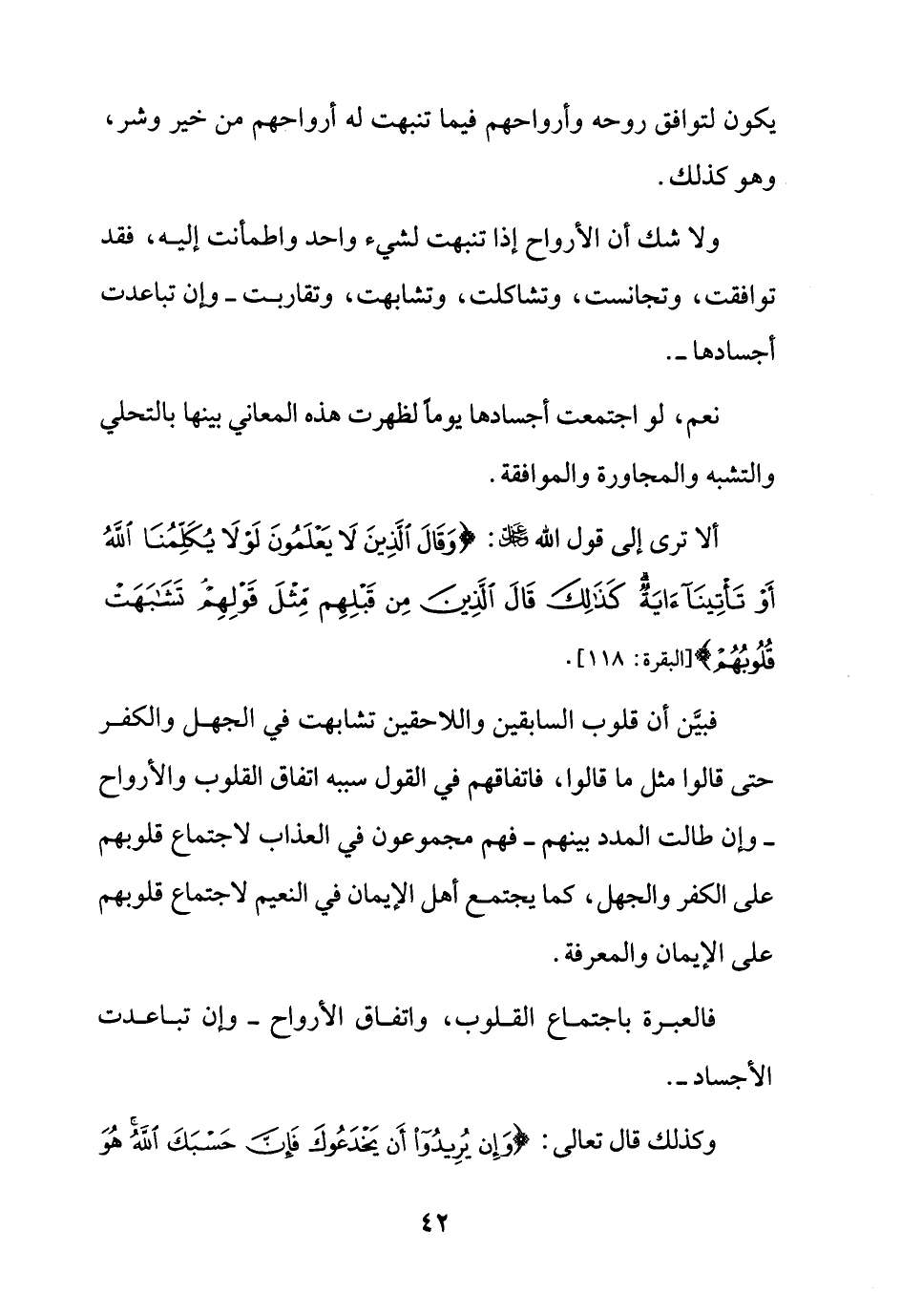 ولا شك أن الأرواح إذا تنبهت لشيء واحد واطمأنت إليه، فقد توافقت، وتجانست، وتشاكلت، وتشابهت، وتقاربت - وإن تباعدت أجسادها -.