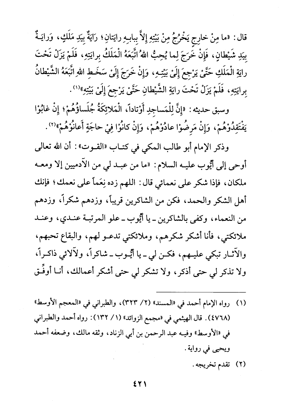 وذكر الإمام أبو طالب المكي في كتاب "القوت": أن الله تعالى أوحى أيُّوب عليه السلام: "ما من عبد لي من الآدميين إلا ومعه ملكان، فإذا شكر على نعمائي قال: اللهم زده نِعَماً على نعمك؛ فإنك أهل الشكر والحمد، فكن من الشاكرين قريباً، وزدهم شكراً، وزدهم من النعماء، وكفى بالشاكرين - ياأيُّوب - علو المرتبة عندي، وعند ملائكتي، فأنا أشكر شكرهم، وملائكتي تدعو لهم، والبقاع تحبهم، والآثار تبكي عليهم، فكن لي - ياأيُّوب - شاكراً، ولآلائي ذاكراً، ولا تذكر لي حتى أذكر، ولا تشكر لي حتى أشكر أعمالك، أنا أوفِّق