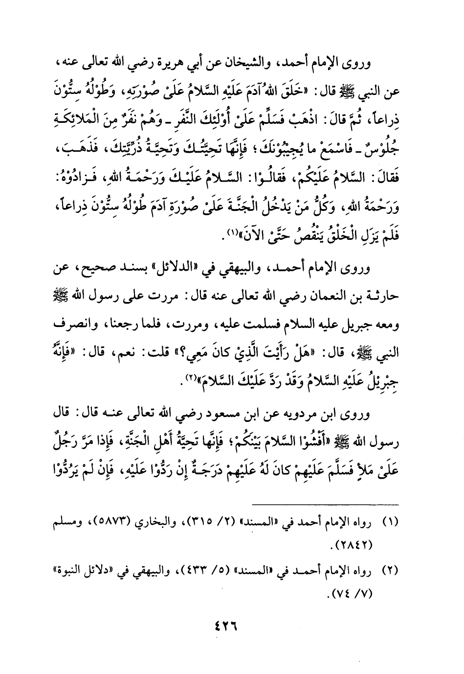 وروى الإمام أحمد، والشيخان عن أبي هريرة رضي الله تعالى عنه، عن النبي - صلى الله عليه وسلم - قال: "خَلَقَ اللهُ آدم عَلَيْهِ السَّلامُ عَلَىْ صُوْرتِهِ، وَطُوْلُهُ سِتُّوْنَ ذِراعاً، ثُمَّ قالَ: اذْهَبْ فَسَلِّمْ عَلَىْ أُوْلَئِكَ النَّفَرِ - وَهُمْ نَفَرٌ مِنَ الْمَلائِكَةِ جُلُوْسٌ - فَاسْمَعْ ما يُجِيبُوْنَكَ؛ فَإِنَّهَا تَحيَّتُكَ وَتَحيَّةُ ذُرَّيَّتِكَ، فَذَهَبَ، فَقالَ: السَّلامُ عَلَيْكُمْ، فَقالُوْا: السَّلامُ عَلَيْكَ وَرَحْمَةُ اللهِ، فَزادُوْهُ: وَرَحْمَةُ اللهِ، وَكُل مَنْ يَدْخُلُ الْجَنَّةَ عَلَىْ صُوْرَةِ آدَمَ طُوْلُهُ سِتُّوْنَ ذِراعاً، فَلَمْ يَزَلِ الْخَلْقُ يَنْقُصُ حَتَّىْ الآنَ" (¬1).